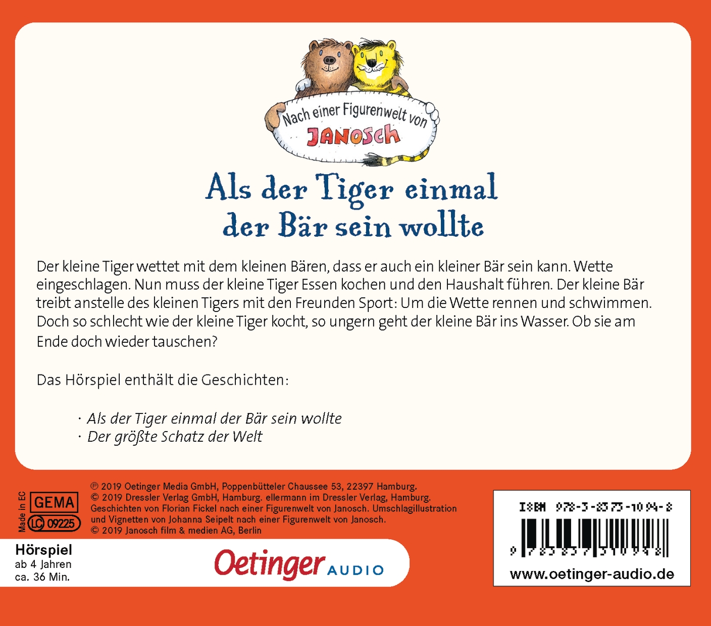 Oh wie schön ist es, einem besten Freund zuzuhören. Tiger und Bär tauschen aus Spaß ihre Rollen. Nun muss der Tiger das Essen kochen und den Haushalt führen. Und der Bär? Der rennt mit den Freunden um die Wette und geht schwimmen. Doch so schlecht wie der Tiger kocht, so ungern geht der Bär zum Schwimmen. Ob sie am Ende doch wieder tauschen? Die Figuren von Janosch begeistern Groß und Klein, denn sie stehen für kleines Glück und großes Herz.