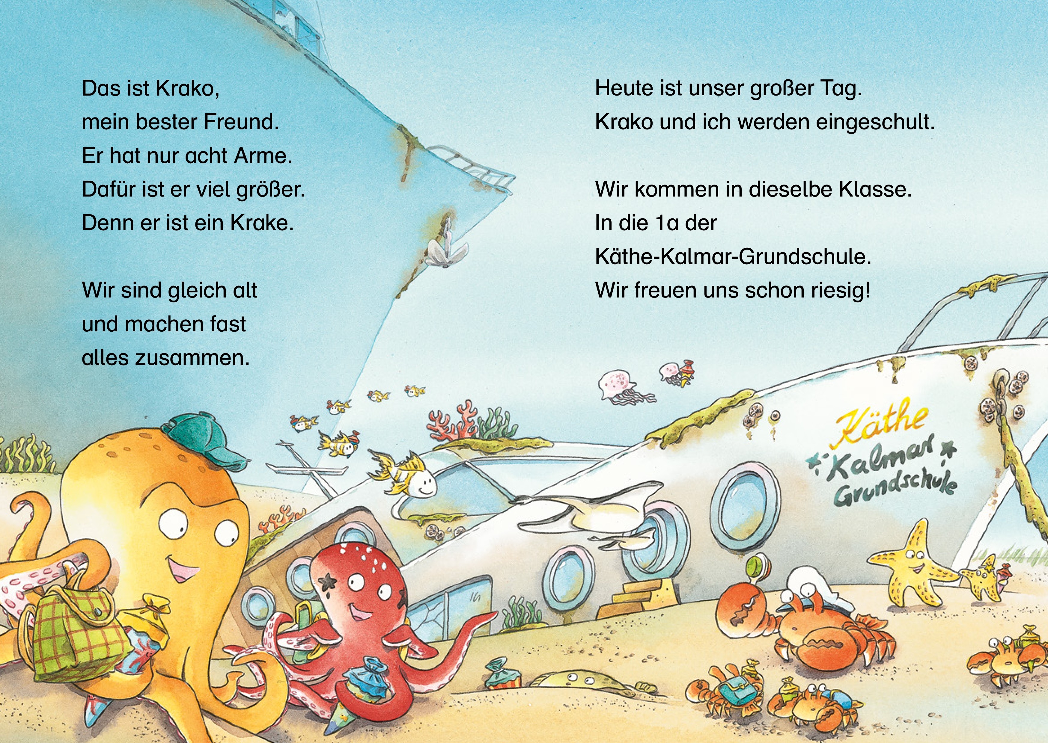 Lesenlernen unter Wasser: Willkommen in Kalmarien! Tintenfisch Inki lebt mit seinen Eltern in Kalmarien, weit unten im Meer. Hier gibt es eine Schule, Restaurants, eine Bücherei und einen Trödelmarkt. Fische, Meeresschildkröten und Seepferdchen leben hier, ebenso wie Muränen, vor denen man sich besser in Acht nimmt. Als Inki eingeschult wird, ist auch die Flunder Fluffi in seiner Klasse. Fluffi spricht kein Kalamarisch und ist auch sonst irgendwie anders. Können sie dennoch Freunde werden? Die Lesestarter von Oetinger motivieren auch leseschwache Kinder zum Lesen. Wie? Mit bekannten Autoren, starken Charakteren und populären Themen, die Kinder im Alter von fünf bis zehn Jahren begeistern. Und mit vielen Bildern, Spielen und Leserätseln. Eine wunderbare Schulgeschichte unter Wasser mit vielen sympathischen Figuren und farbenfroh illustriert.