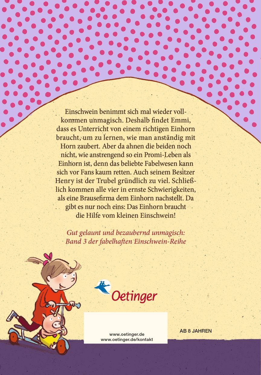 Einschwein benimmt sich mal wieder vollkommen unmagisch. Deshalb findet Emmi, dass es Unterricht von einem richtigen Einhorn braucht, um zu lernen, wie man anständig mit Horn zaubert. Aber da ahnen die beiden noch nicht, wie anstrengend so ein Promi-Leben als Einhorn ist, denn das beliebte Fabelwesen kann sich vor Fans kaum retten. Auch seinem Besitzer Henry ist der Trubel gründlich zu viel. Schließlich kommen alle vier in ernste Schwierigkeiten, als eine Brausefirma dem Einhorn nachstellt. Da gibt es nur noch eins: Das Einhorn braucht die Hilfe vom kleinen Einschwein. Gutgelaunt und bezaubernd unmagisch: Band 3 der fabelhaften Einschwein-Reihe