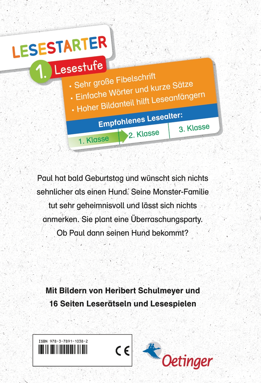 Monsterparty für einen Menschenjungen - wild, witzig, warmherzig! Paul hat Geburtstag. Er wünscht sich sehnlichst einen Hund. Seine Familie, die Familie Monster, tut sehr geheimnisvoll. Als er mittags aus der Schule kommt, ist das Haus voller Monster - Überraschungsparty! Zur Begrüßung brüllen alle zusammen so laut "Alles Gute!", dass Paul rückwärts in den Garten fliegt. Ein riesiges Durcheinander entsteht. Und dabei ist Paul doch so gespannt auf sein Geschenk. Die Lesestarter von Oetinger motivieren auch leseschwache Kinder zum Lesen. Wie? Mit bekannten Autoren, starken Charakteren und populären Themen, die Kinder im Alter von fünf bis zehn Jahren begeistern. Und mit vielen Bildern, Spielen und Leserätseln. Bei dieser monstermäßigen Geburtstagsparty kommt der Spaß am Lesen ganz von allein, denn Rüdiger Bertrams cleverer Text und die witzigen Illustrationen von Heribert Schulmeyer lassen ein Zusammengehörigkeitsgefühl aufkommen und eigene Stärken erkennen.