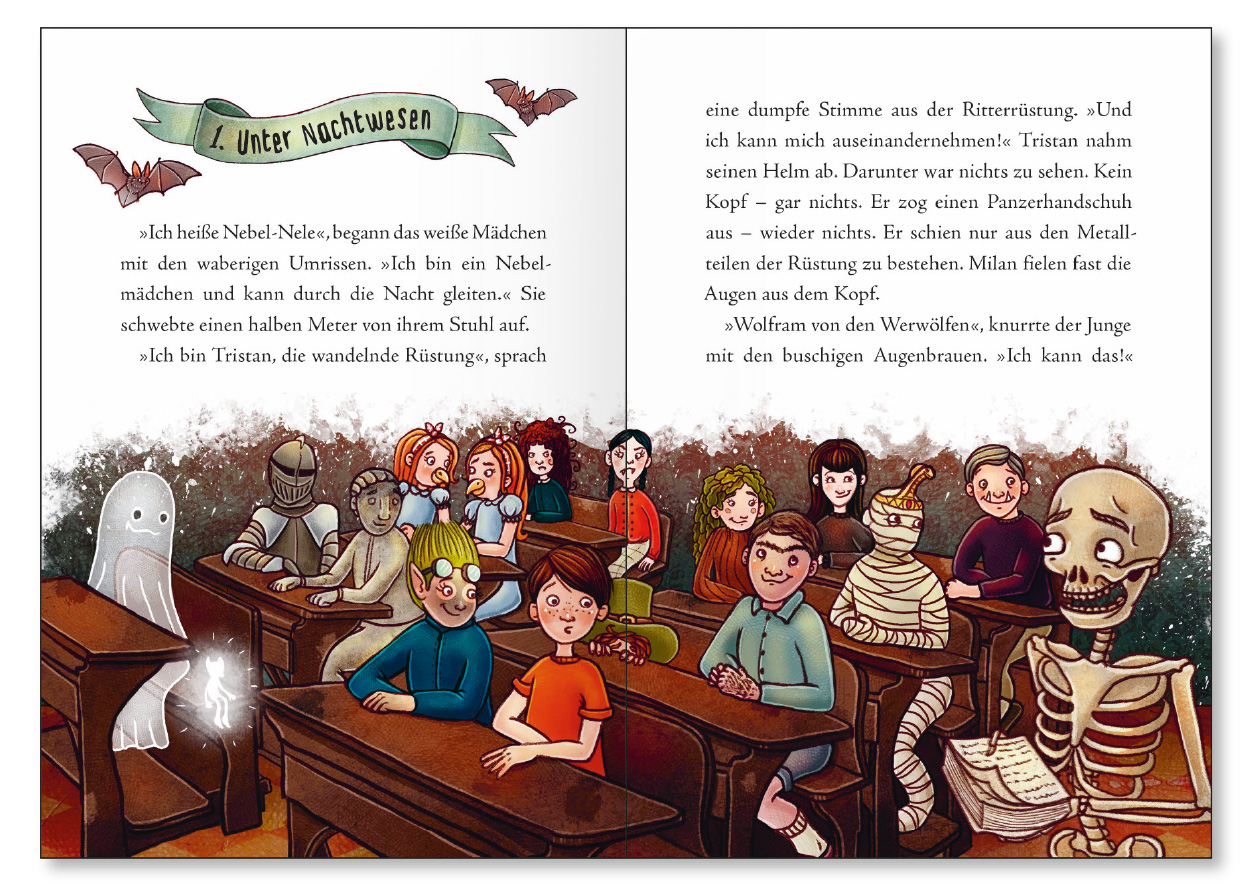 Handelt es sich um einen Scherz? Warum sollte Milans neue Schule zu nachtschlafender Zeit anfangen? Doch als er sich pünktlich um Mitternacht am Friedhofswinkel einfindet, wird ihm schnell klar, wieso: Seine neue Schule ist eine Monsterschule und er der einzige Mensch unter Vampiren, Irrlichtern, Ghulen und Nebelgeistern! Wie lange wird Milan wohl unentdeckt bleiben?