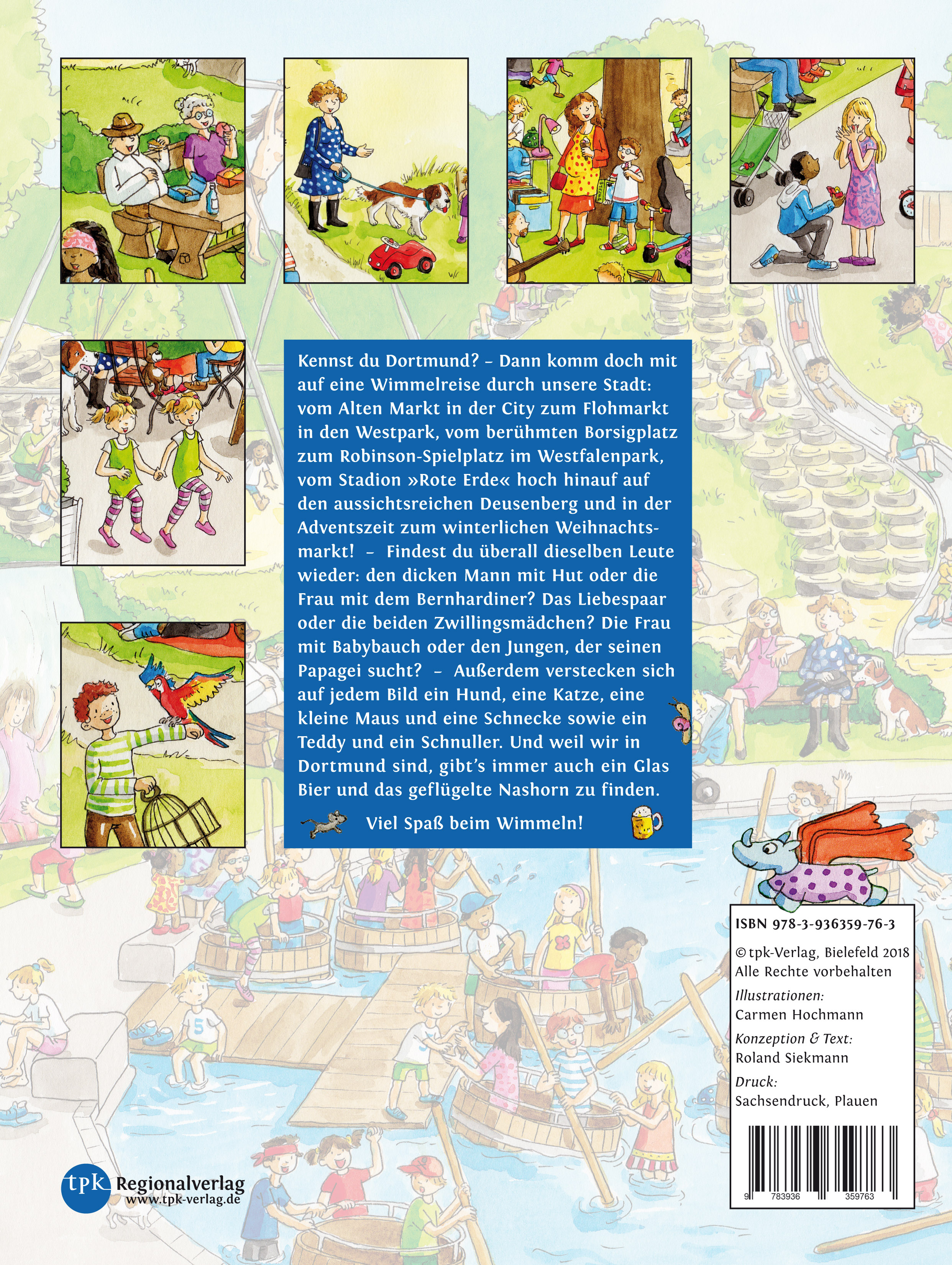Kennst du Dortmund? - Dann komm doch mit auf eine Wimmelreise durch unsere Stadt: vom Alten Markt in der City zum Flohmarkt in den Westpark, vom berühmten Borsigplatz zum Robinson-Spielplatz im Westfalenpark, vom Stadion »Rote Erde« hoch hinauf auf den aussichtsreichen Deusenberg und in der Adventszeit zum winterlichen Weihnachtsmarkt! Und findest du überall dieselben Leute wieder: den dicken Mann mit Hut oder die Frau mit dem Bernhardiner? Das Liebespaar oder die beiden Zwillingsmädchen? Die Frau mit Babybauch oder den Jungen, der seinen Papagei sucht? Außerdem verstecken sich auf jedem Bild ein Hund, eine Katze, eine kleine Maus und eine Schnecke sowie ein Teddy und ein Schnuller. Und weil wir in Dortmund sind, gibt's immer auch ein Glas Bier und das geflügelte Nashorn zu finden. Viel Spaß beim Wimmeln!