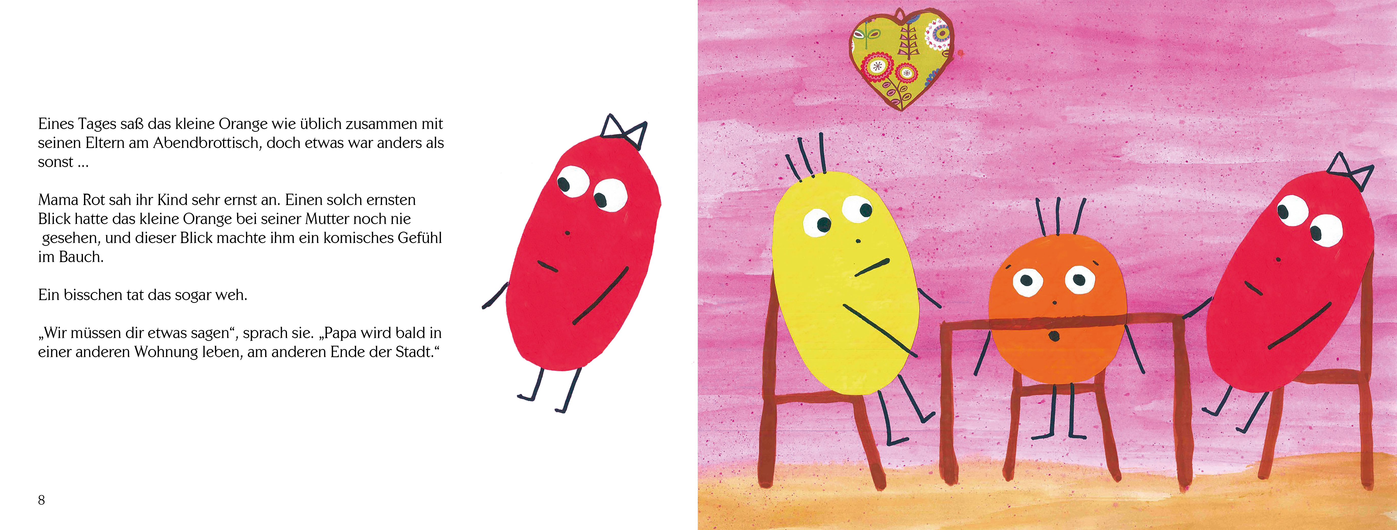 Das kleine Orange ist ein fröhliches Kind. Zusammen mit Mama Rot und Papa Gelb lebt es glücklich am Stadtrand in einem gemütlichen Haus. Gerne schaukelt es im Garten so hoch, dass es glaubt, mit den Zehenspitzen die Sonne berühren zu können. Das kleine Orange fühlt sich sicher und geborgen, wenn Mama und Papa in der Nähe sind und ihm beim Schaukeln zusehen. Doch alles ändert sich, als ihm seine Mutter eines Abends am Abendbrottisch erklärt, dass Papa bald alleine in eine andere Wohnung am anderen Ende der Stadt ziehen wird. Die Eltern wollen sich trennen! Als Papa Gelb ausgezogen ist, ist das kleine Orange so traurig, dass es seine gelbe Farbe verliert und sich rot verfärbt. Papa fehlt ihm einfach. Seine Mutter überlegt mit ihm gemeinsam, was dem Kind helfen könnte, und so freut sich das kleine Orange auf sein erstes Besuchswochenende in Papas neuem Zuhause. Doch dort fehlt ihm Mama Rot, und wieder wird ihm ganz weh ums Herz. Kann Papa Gelb ihm jetzt helfen?