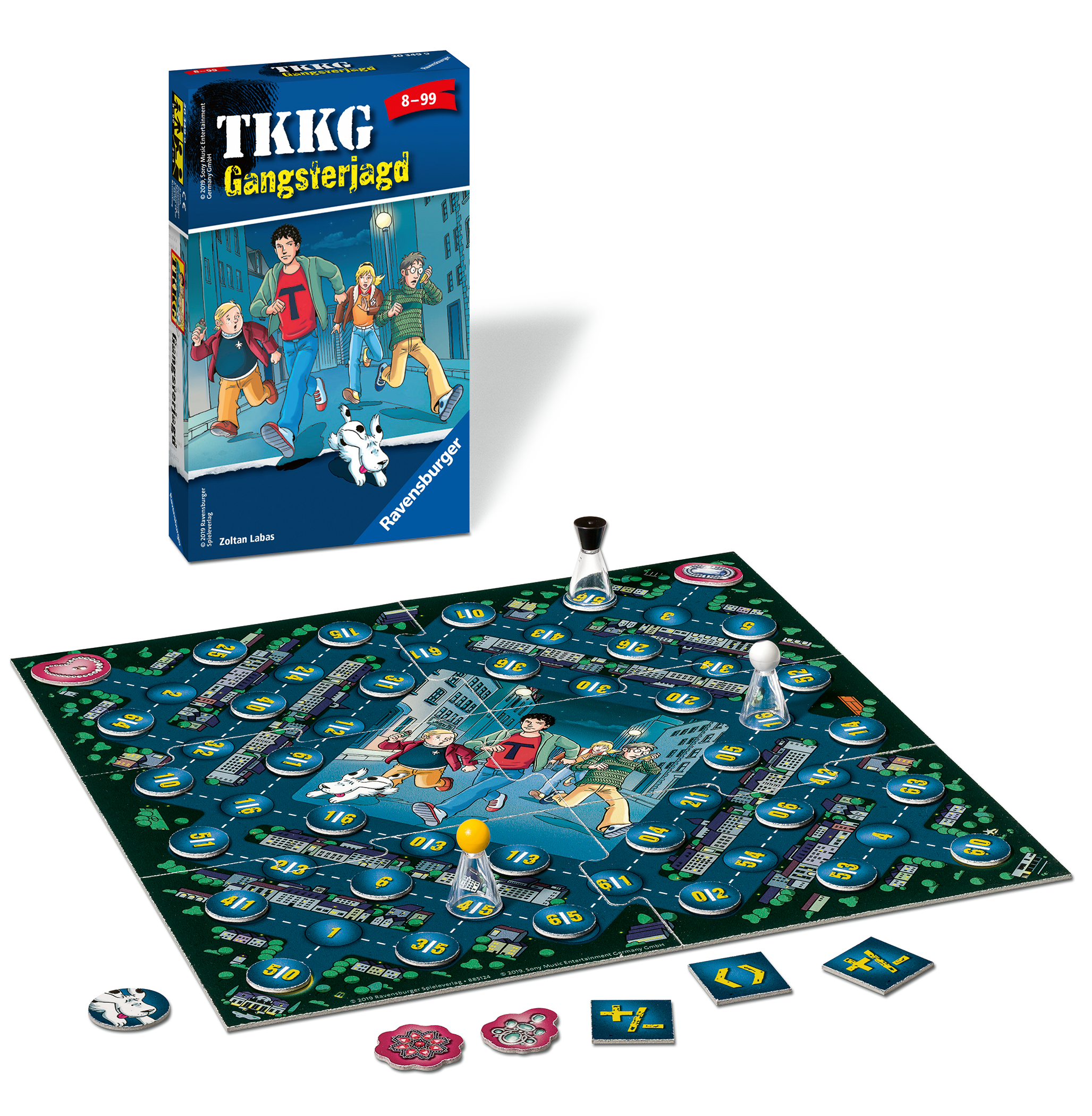 Helle Aufregung in der Millionenstadt: Ein Juwelendieb treibt sein Unwesen und hat schon mehrere Villen ausgeraubt! Ein Fall für TKKG. In zwei Teams versuchen die Detektive, durch gute Absprache und vorausschauendes Denken den Gangster zu schnappen. Zahlenchips bestimmen, wie weit die Spieler ziehen dürfen. Gelingt es dem Gangster, die Beute der vier Villen in der Vorstadt zu ergattern, gewinnt er das Spiel. Wird er vorher von TKKG geschnappt, haben sie ihren Fall erfolgreich gelöst. Spiel-Inhalt: 1 Spielplan, 3 Spielfiguren, 32 Zahlenchips, 1 Chip Oskar, 3 Gangsterchips, 4 Beutechips. Spieleranzahl: 2-4. Spieldauer: 10-15 Min. Spieleanleitung in deutsch.