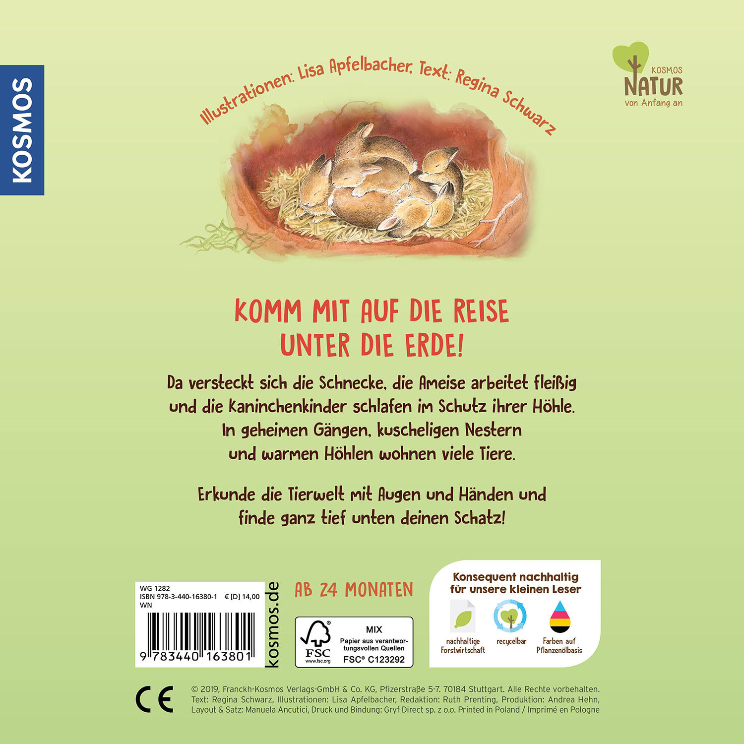 Nanu, Löcher im Buch? Ja, und zwar ganz besondere! Die Lochstanzungen lenken den Blick und die Fingerchen der Kinder in geheimnisvolle Welten. Welche Tiere verstecken sich unter der Erde? Mit jedem Umblättern wird der Einblick in die Lebenswelt der Tiere intensiver. Zauberhafte, naturgetreue Zeichnungen von Lisa Apfelbacher zeigen Tiere, die man sonst nicht sieht, in typischen oder lustigen Situationen, die die Kinder begeistern und sich einprägen. In charmanten Reimen von Regina Schwarz werden Röhrenspinne, Schnecke, Regenwurm, Ameise, Hummel, Waldmaus, Maulwurf, Wildkaninchen, Fuchs und Dachs vorgestellt. KOSMOS Natur von Anfang an - konsequent nachhaltig.Produziert nach dem zertifizierten Cradle-to-Cradle-Prinzip.