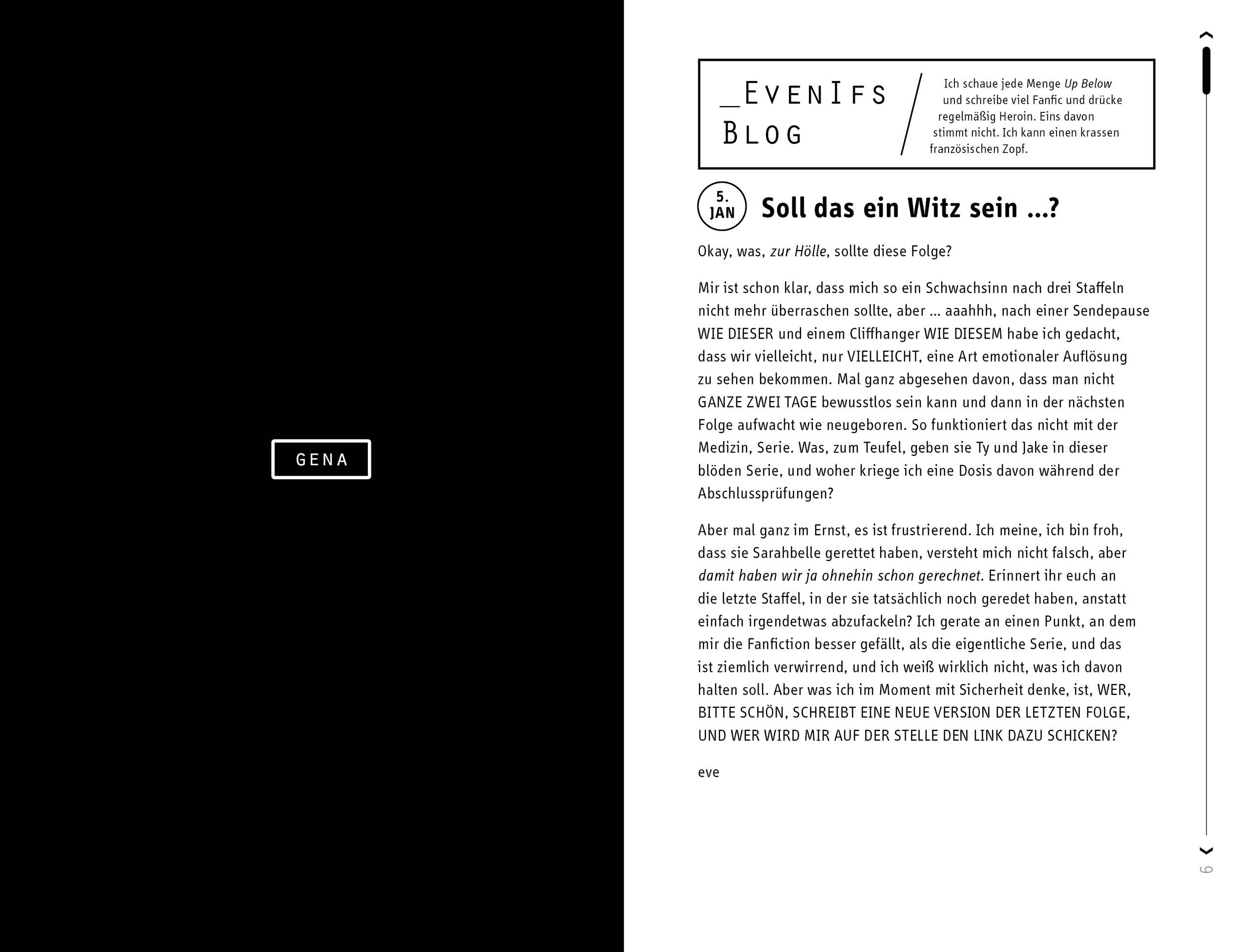 Gena besucht seit kurzem das College und ihr Sozialleben findet hauptsächlich online statt, während Stephanie, genannt Finn, bereits mitten in der Jobsuche und einer Beziehungskrise steckt. Wenn sie nicht beide in Fanfiktion-Foren und Blogs zur beliebten TV-Serie UP BELOW unterwegs wären, wären die Mädchen sich nie begegnet und doch entsteht zwischen ihnen eine echte Freundschaft. Eine Freundschaft, die auf eine harte Probe gestellt wird, als Gena im wahren Leben aus der Bahn gerät ...