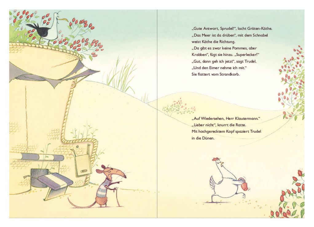 »Mit kindlichem Humor und niedlichen Illustrationen schildern Eva Muszynski und Karsten Teich die Geschichte eines mutigen Huhns, das an die Freiheit gelangt.«
