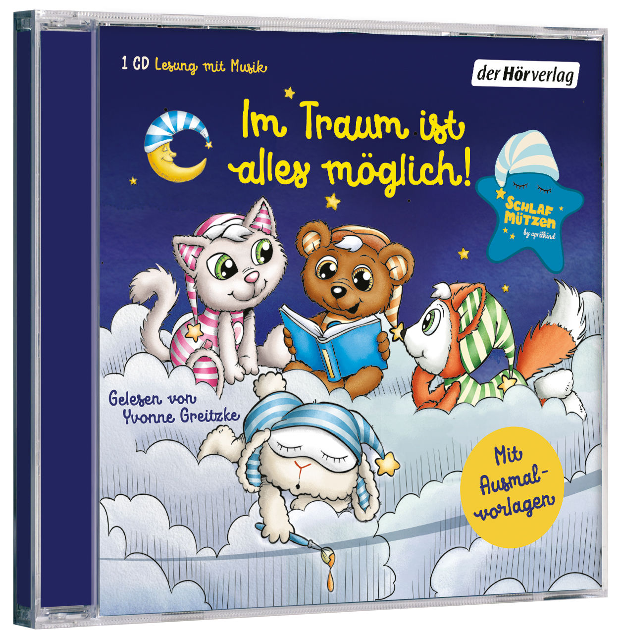 Die Schlafmützen kennen die besten Einschlaflieder und wissen, wie man die schönsten Träume träumt, können super zuhören, und tolle Geschichten erzählen. Das alles lernen Bär Tommsy, Schaf Wulli, Katze Kimsi, Fuchs Finjo, Koala Kappy, Pinguin Koosy, Hund Woofl und Einhorn Fyala in der Schlafmützenschule in Schlummerland, wo sie zu wahren Freunden für die Nacht ausgebildet werden. Bei Im Traum ist alles möglich hilft Schaf Wulli dem kleinen Leon ein Bild für seinen Opa zu malen. Wulli erzählt Leon, wie er in der Schlafmützenschule einmal beim Malen alles um sich herum vergessen hat und in einer fantastischen Traumwelt versunken ist.Gelesen von Yvonne Greitzke.(1 CD, Laufzeit: 47 min)