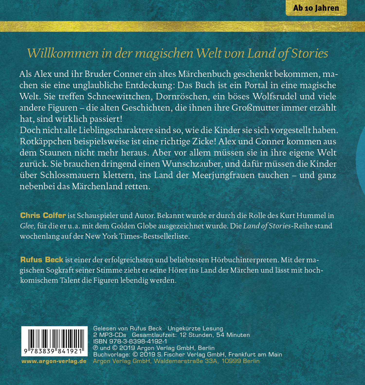 lt;p>Als Alex und ihr Bruder Conner ein altes Märchenbuch geschenkt bekommen, machen sie eine unglaubliche Entdeckung: Das Buch ist ein Portal in eine magische Welt! Sie treffen Schneewittchen, Dornröschen, ein böses Wolfsrudel und viele andere Figuren - die alten Geschichten, die ihnen ihre Großmutter immer erzählt hat, sind wirklich passiert! Doch nicht alle Lieblingscharaktere sind so, wie die Kinder sie sich vorgestellt haben. Rotkäppchen beispielsweise ist eine richtige Zicke! Alex und Conner kommen aus dem Staunen nicht mehr heraus. Aber vor allem müssen sie in ihre eigene Welt zurück. Sie brauchen dringend einen Wunschzauber, und dafür müssen die Kinder über Schlossmauern klettern, ins Land der Meerjungfrauen tauchen - und ganz nebenbei das Märchenland retten.