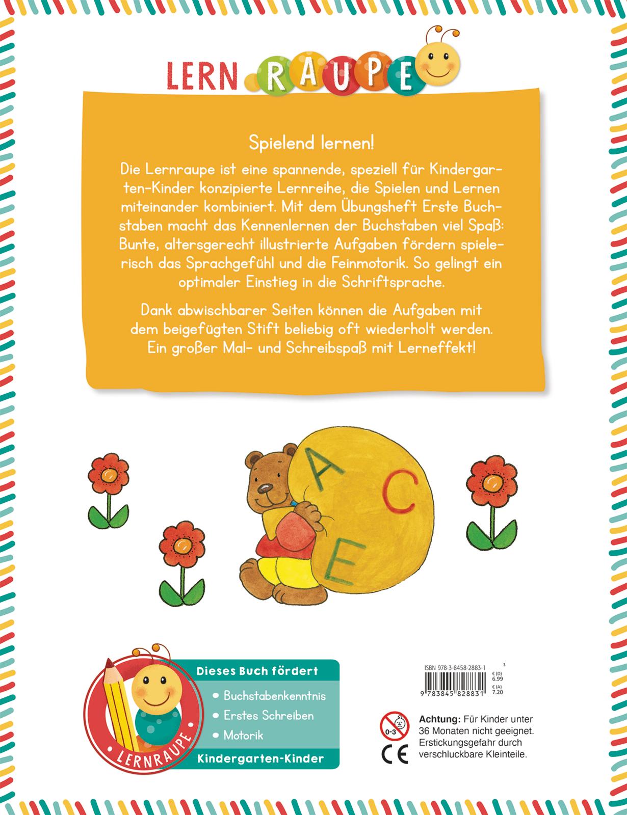 Spielend lernen! Die Lernraupe ist eine spannende, speziell für Kindergartenkinder konzipierte Lernreihe, die Spielen und Lernen miteinander kombiniert. Mit dem Übungsheft Erste Buchstaben macht das Kennenlernen der Buchstaben viel Spaß: Bunte, altersgerecht illustrierte Aufgaben fördern spielerisch das Sprachgefühl und die Feinmotorik. So gelingt ein optimaler Einstieg in die Schriftsprache. Dank abwischbarer Seiten können die Aufgaben mit dem beigefügten Stift beliebig oft wiederholt werden. Ein großer Mal- und Schreibspaß mit Lerneffekt!
