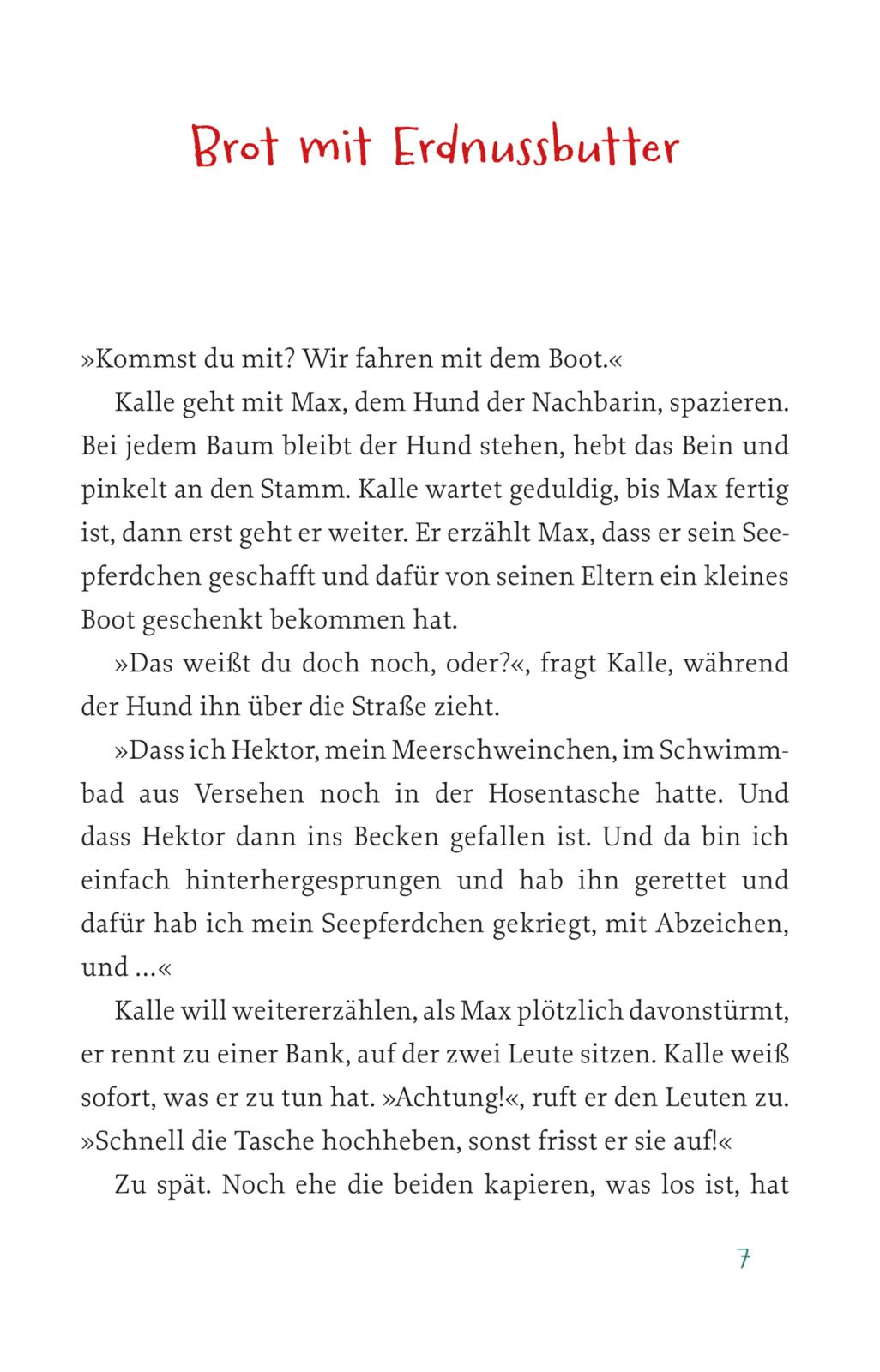 Kalle bekommt ein Boot. Sein eigenes Boot! Das muss er sofort ausprobieren. Und zwar zusammen mit Max, dem Hund der Nachbarin, und natürlich dem Meerschweinchen Hektor. Aber so einfach ist das gar nicht. Jedenfalls erstmal. Dann aber fahren alle drei auf den Fluss hinaus zu den großen Schiffen. Das ist toll, aber fast zu spannend. Zum Glück trifft Kalle unterwegs Septimia. Die hat kein Haustier, also schenkt Kalle ihr Hektor. Dann muss er weiter, mehr Abenteuer erleben, ehe er die beiden schließlich zum Eisessen wiedersieht.