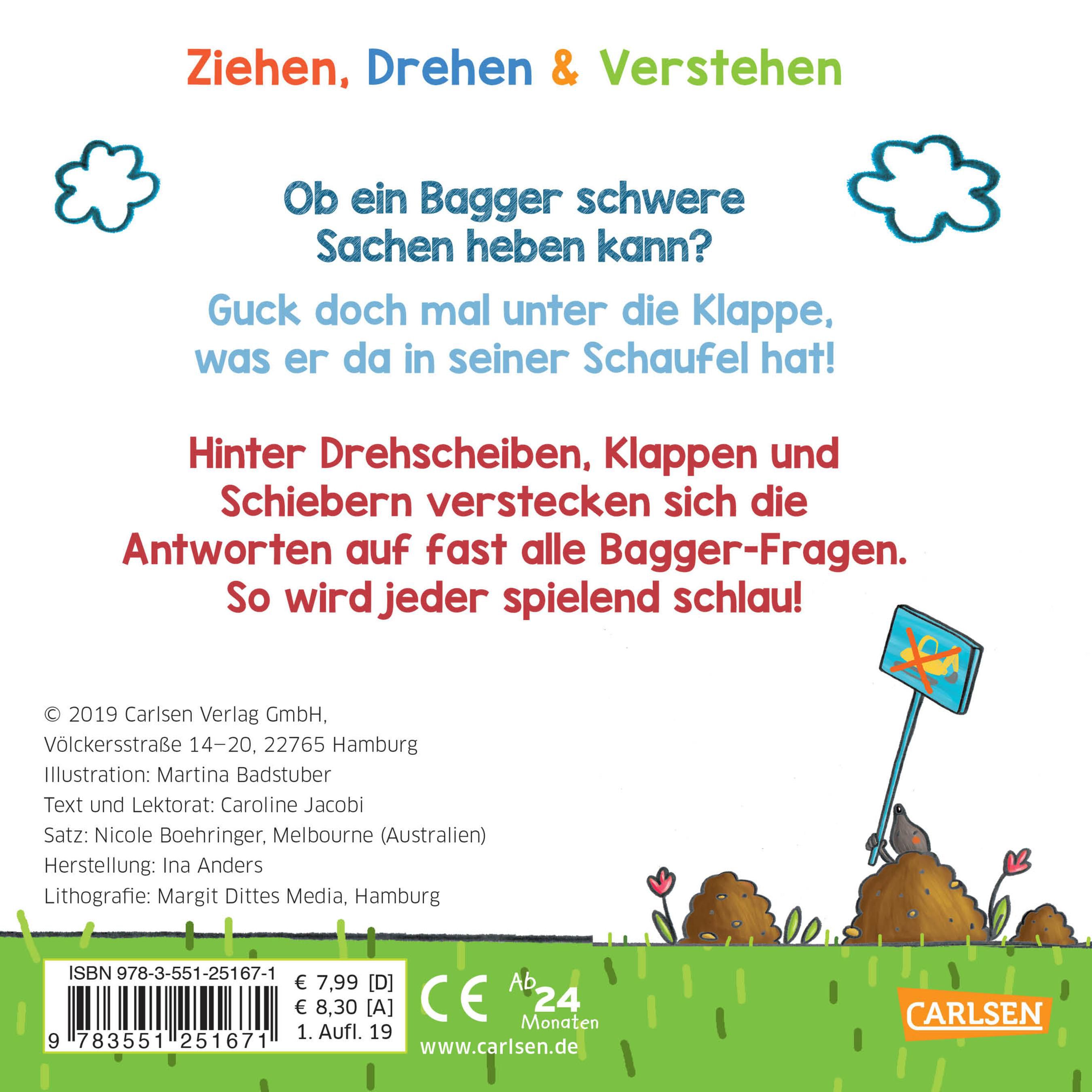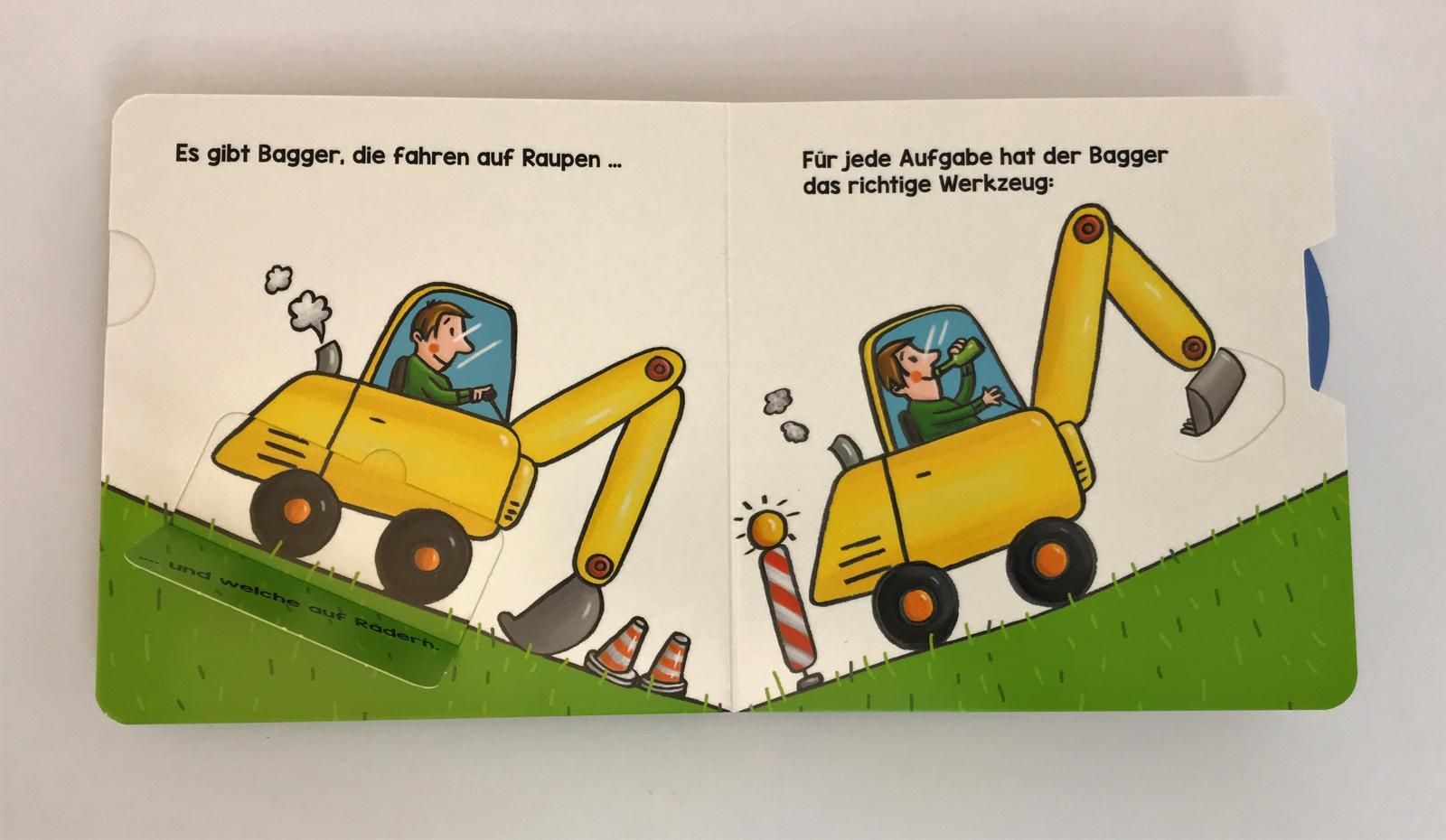Ob ein Bagger schwere Sachen heben kann? Guck doch mal unter die Klappe, was er da in seiner Schaufel hat! Kann ein Bagger Häuser einreißen? Welche Werkzeuge hat ein Bagger? Welche Bagger gibt es? Hinter Drehscheiben, Klappen und Schiebern verstecken sich die Antworten auf fast alle Bagger-Fragen.