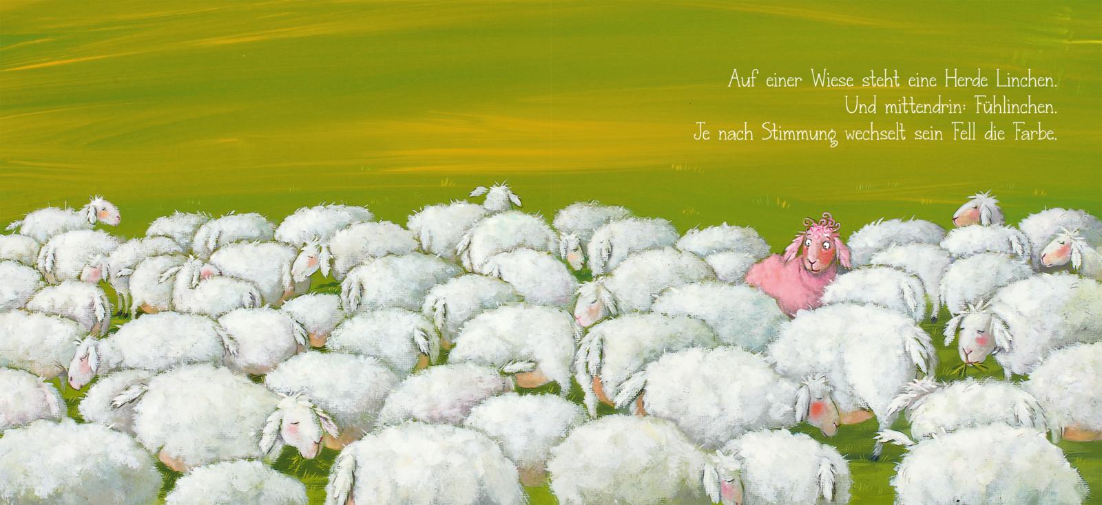 Eine Herde Linchen steht auf der Weide und mittendrin ein ganz besonderes - das Fühlinchen. Je nach Stimmung wechselt sein Fell die Farbe. Und weil die anderen Linchen immer nur weiß bleiben, beschließt es, ein anderes Fühlinchen zu suchen.