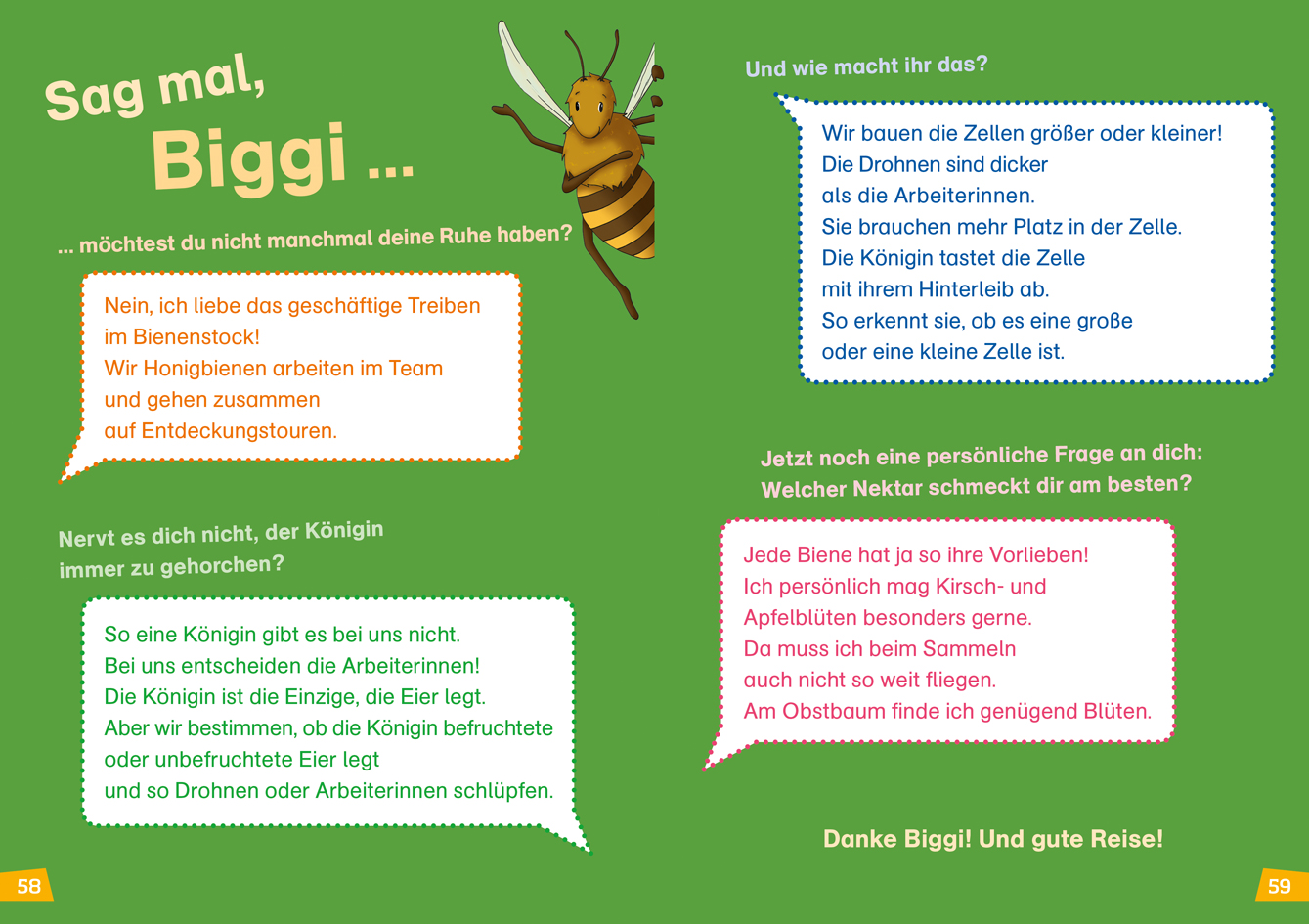 Biggi, die Biene führt Erstleser durch dieses Buch, das verständliches Sachwissen zum Trend-Thema "Bienen" bietet. Große Fibelschrift und kurze Textabschnitte erleichtern das selbständige Lesen. Anhand des Lesequiz am Ende jedes Kapitels und des Buches können die Kinder spielerisch prüfen, ob sie alles richtig verstanden haben.