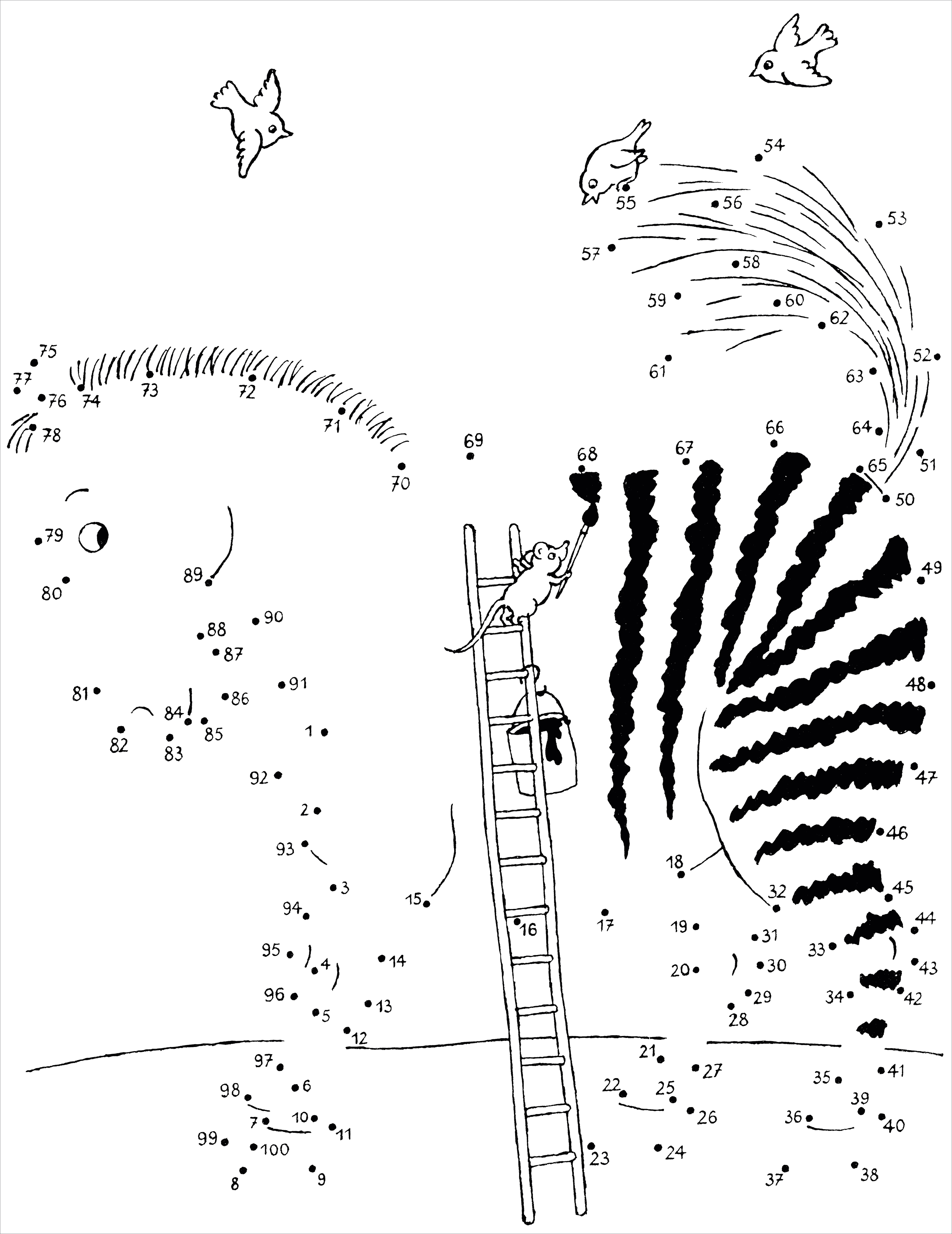 Werden die einzelnen Punkte - Zahlen von 1 bis 100 - in der richtigen Reihenfolge verbunden, entstehen tolle Bilder. Astronaut, Riesenschlange oder Heißluftballon - sie können nach Belieben ausgemalt werden.