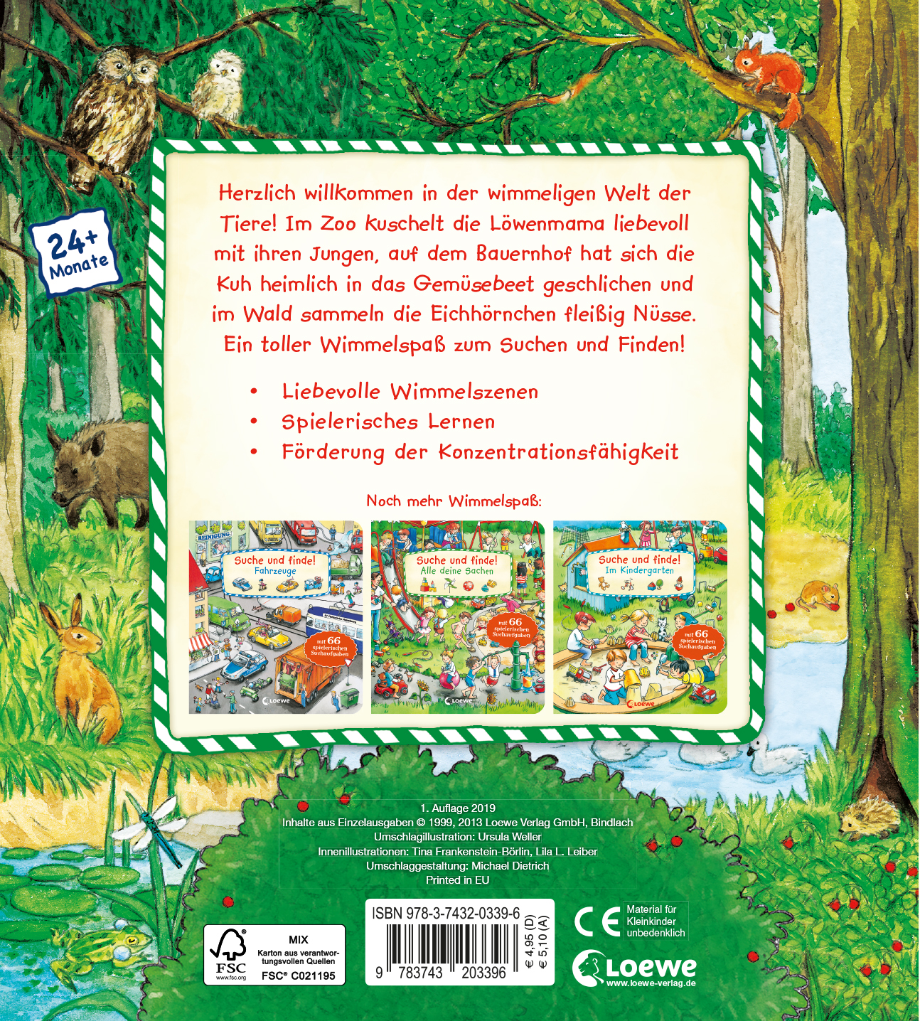 Herzlich willkommen in der wimmeligen Welt der Tiere! Im Zoo kuschelt die Löwenmama liebevoll mit ihren Jungen, auf dem Bauernhof hat sich die Kuh heimlich in das Gemüsebeet geschlichen und im Wald sammeln die Eichhörnchen fleißig Nüsse. Ein toller Wimmelspaß zum Suchen und Finden!