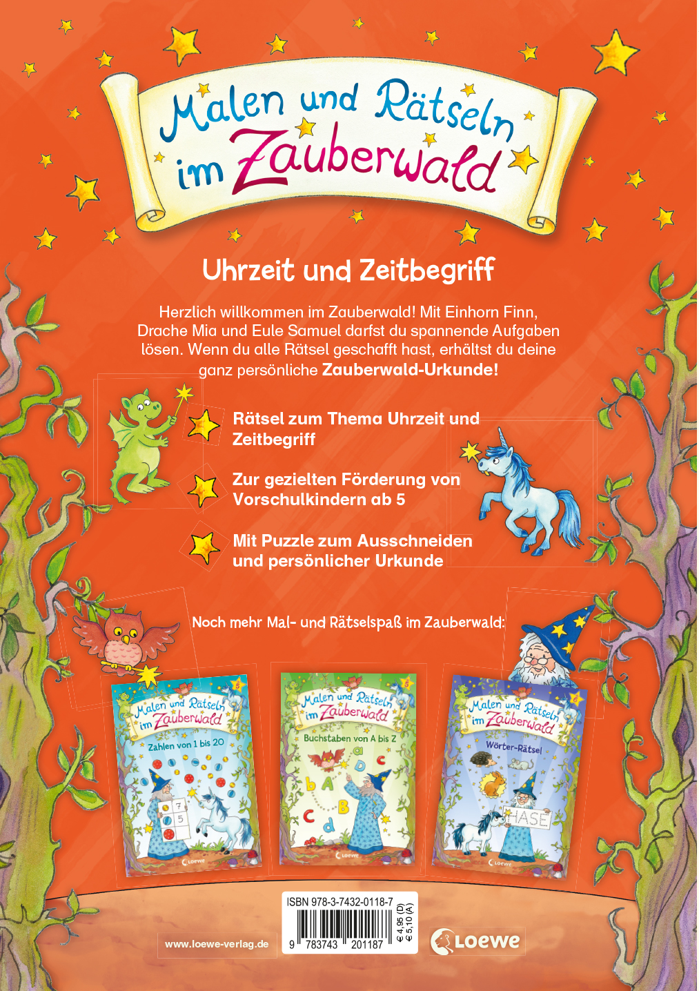 Zusammen mit Einhorn Finn, Drache Mia und Eule Samuel gehen Vorschulkinder auf magische Entdeckungsreise durch abwechslungsreiche Rätsel rund um das Thema Uhrzeit und Zeitbegriff . Am Ende wartet ein Puzzle zum Ausschneiden , mit dem sie nach und nach ihre eigene Zauberwald-Urkunde zusammensetzen können.