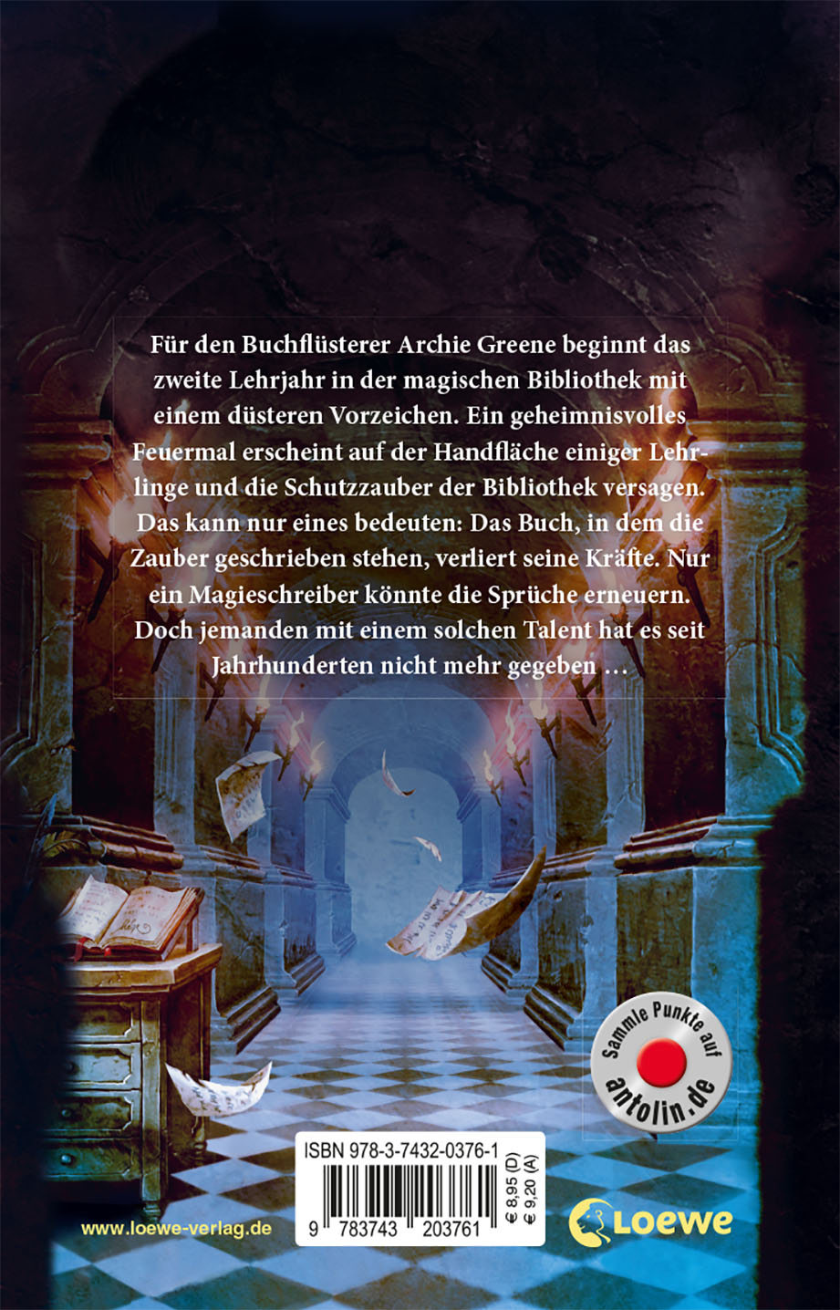Buchflüsterer Archie Greene beginnt das zweite Lehrjahr in der magischen Bibliothek mit einem düsteren Vorzeichen. Ein geheimnisvolles Feuermal erscheint auf der Handfläche einiger Lehrlinge und die Schutzzauber der Bibliothek versagen. Das kann nur eines bedeuten: Das Buch, in dem die Zauber geschrieben stehen, verliert seine Kräfte. Nur ein Magieschreiber könnte die Sprüche erneuern. Doch jemanden mit einem solchen Talent hat es seit Jahrhunderten nicht mehr gegeben ...