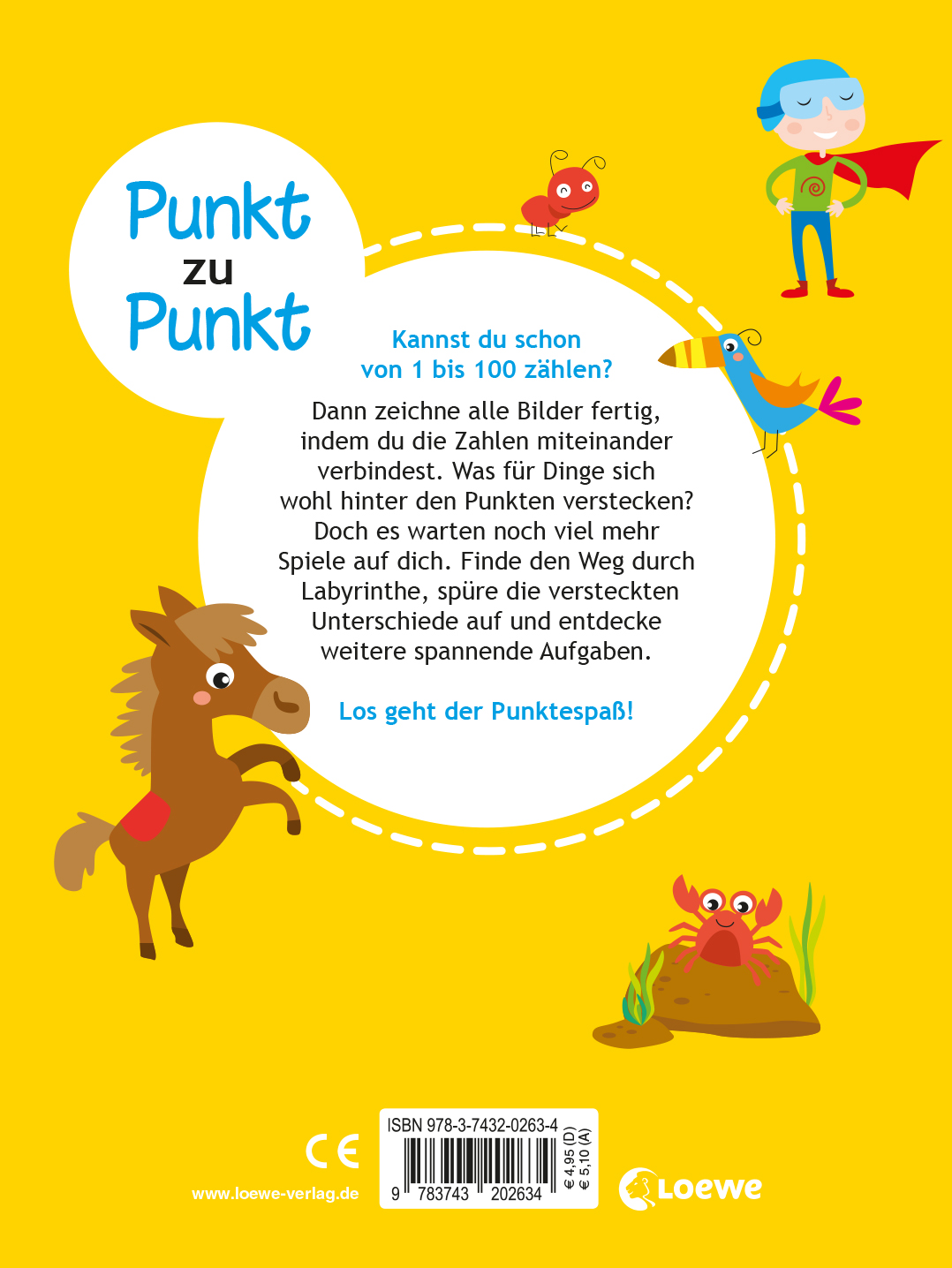 Hier warten kunterbunte Punkterätsel darauf, von Kindern ab 7 Jahren gelöst zu werden. Von Punkt zu Punkt lassen die kleinen Rätselmeister versteckte Bilder auf den Seiten erscheinen - und lernen so ganz nebenbei die Zahlen von 1 bis 100. Durch die modernen, farbenfrohen Illustrationen und weitere abwechslungsreiche Spiele wie Labyrinthe oder Ausmalbilder kommt garantiert keine Langeweile auf!