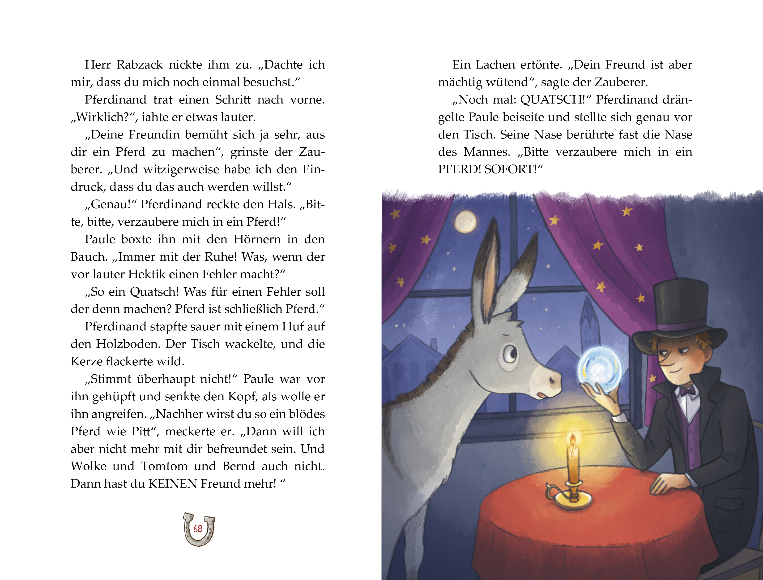 Lenni hat Geburtstag, und bei seiner Feier auf dem Klausenhof gibt es eine ganz besondere Überraschung: eine Zaubervorstellung für das Geburtstagskind und seine Gäste. Pferdinand ist hin und weg - der Zauberer kann zwei weiße Mäuse aus dem Hut zaubern! Kann er dann vielleicht auch einen Esel in ein Pferd verwandeln und Pferdinand so seinen allergrößten Herzenswunsch erfüllen?