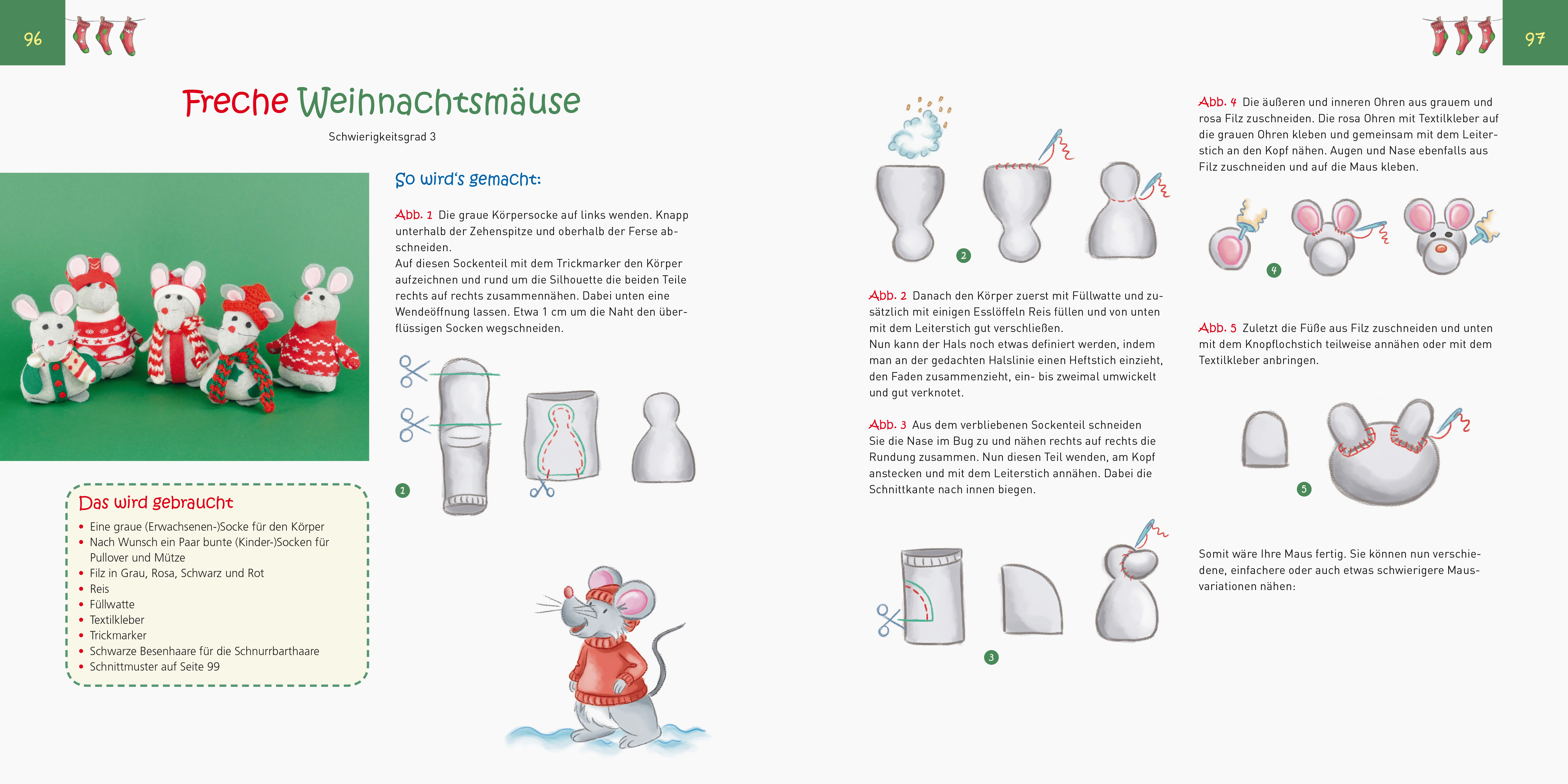 Socken können so viel mehr als Füße wärmen. Dieses Buch zeigt, wie man daraus kleine Kuscheltiere näht - perfekt für das Basteln und Nähen mit Kindern!Es ist erstaunlich, welch wandelbare Näh- und Bastelgrundlage das Alltagskleidungsstück Socke sein kann. Mit den 24 enthaltenen Näh-Anleitungen entstehen in Handumdrehen aus einfachen Socken, ein wenig Bastelmaterial und Freude am Nähen oder Basteln lustige Kuscheltiere, Dekofiguren und kleine Geschenke. Für jede Jahreszeit finden sich die passenden Stofftiere: Der Plüschhase und das Kuschellamm, Stoffaffen und Fische für den Sommer, Kuschelmonster und Gespenster für den Herbst sowie kleine Schneemänner und Weihnachtswichtel für den Winter. Die Näh-Anleitungen sind leicht nachzuvollziehen und auch für Kinder gut verständlich. Somit steht dem Bastelnachmittag mit Kindern nichts im Wege!