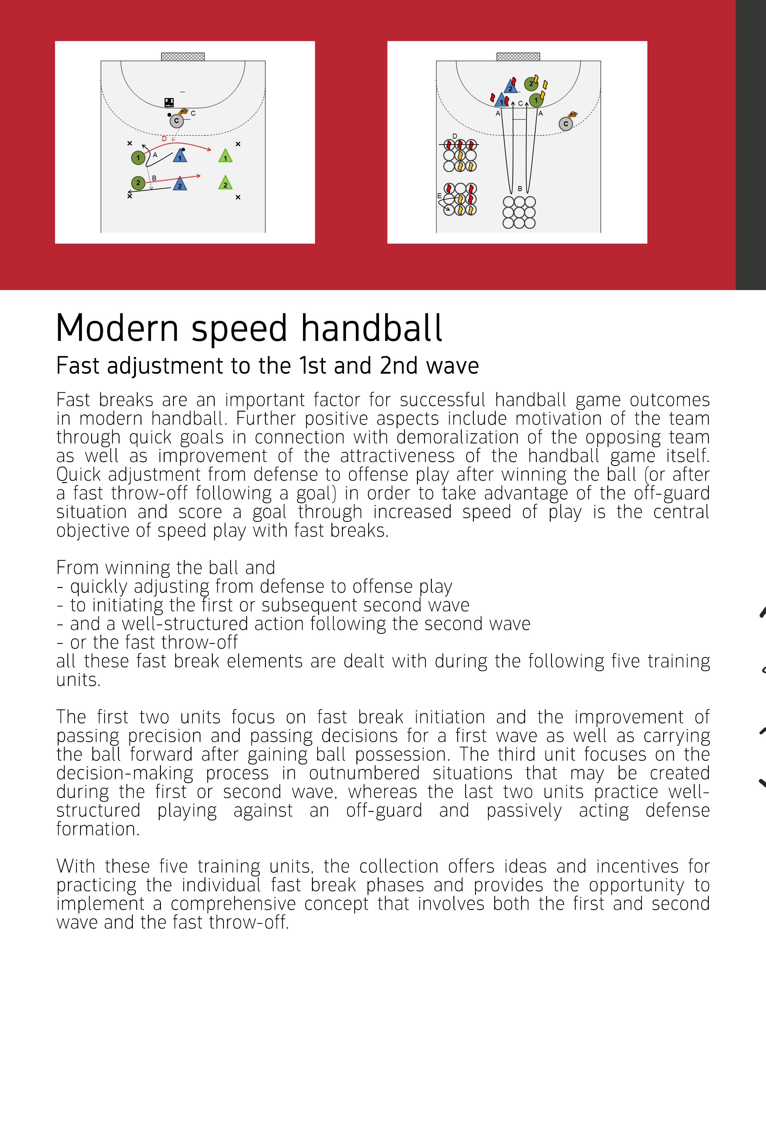 The first two units focus on fast break initiation and the improvement of passing precision and passing decisions for a first wave as well as carrying the ball forward after gaining ball possession. The third unit focuses on the decision-making process in outnumbered situations that may be created during the first or second wave, whereas the last two units practice well-structured playing against an off-guard and passively acting defense formation.