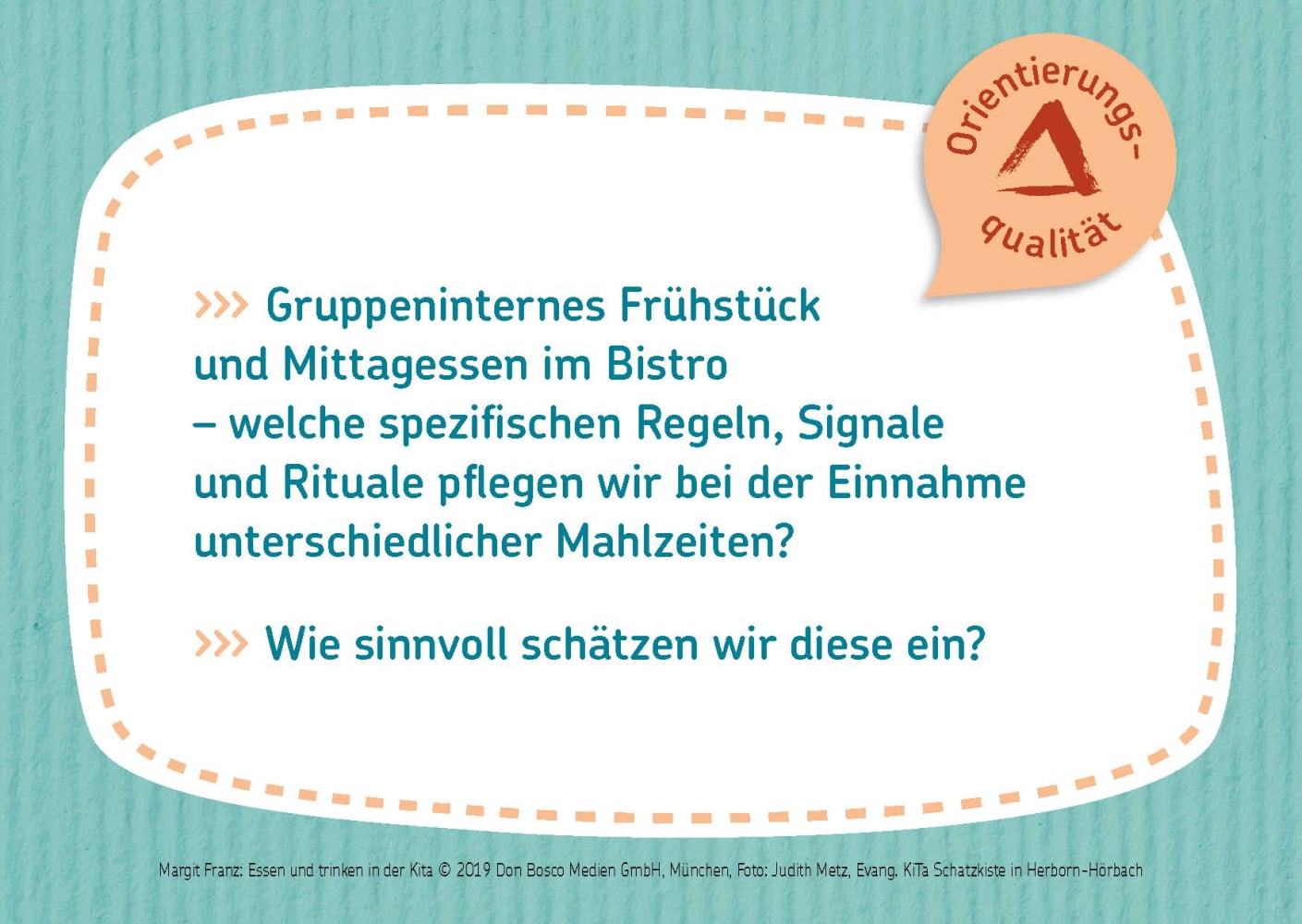 Mahlzeiten in der Kita stillen nicht nur Hunger und Durst. Sie sind wichtige Schlüsselsituationen, in denen Kinder Gemeinschaft erfahren und Zugehörigkeit erleben. Sie lernen eigenständig zu essen und das eigene Hunger- und Sattheitsgefühl selbst zu regulieren. Mit diesen Foto- und Textimpulsen steht Ihnen für die Teamrunde eine anschauliche, selbsterklärende und direkt einsetzbare Methode zur Verfügung, um die Qualität Ihrer Arbeit zu besprechen und weiterzuentwickeln. Die Box enthält 33 Karten, mit gesprächsanregenden Fotos auf der Vorder- und Impulsfragen auf der Rückseite, die nach verschiedenen Qualitätsbereichen farblich gegliedert sind. Impulsbeispiele: Bestimmen die Kinder die Menge an Speisen und Getränken selbst? Was erfahren sie über die Zubereitung der Speisen? Werden religiöse Speisenvorschriften, kulturelle Vielfalt und medizinische Notwendigkeiten beachtet? Wie geschmackvoll ist unser Tisch gedeckt? Können Kinder Wünsche äußern? Wie sieht es mit meiner Vorbildfunktion aus?