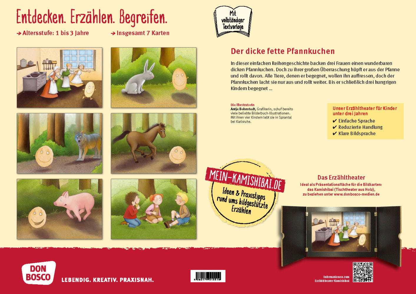 Kamishibai mit Kindern im Krippenalter: Drei Frauen backen einen wunderbaren dicken Pfannkuchen. Doch zu ihrer großen Überraschung hüpft er aus der Pfanne und rollt davon. Alle Tiere, denen er begegnet, wollen ihn auffressen, doch der Pfannkuchen rollt schnell weiter, bis er schließlich drei hungrigen Kindern begegnet ... Abgestimmt auf die Bedürfnisse der Ein- bis Dreijährigen werden die Märchen dieser Serie in einfacher Sprache erzählt und auf die wesentlichen Ereignisse reduziert. Die Textvorlage, die der Geschichte beiliegt, zeichnet sich durch kurze Sätze, einfachen Wortschatz, wenige Nebensätze und reduzierten Inhalt aus. Um der Aufmerksamkeitsfähigkeit der Jüngsten gerecht zu werden, werden die wichtigsten Geschehnisse mit einer deutlichen Bildsprache auf 6 Bildkarten dargestellt.