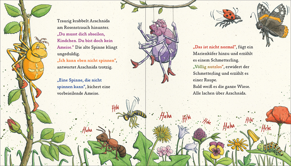 Geboren 1968 in Ostwestfalen, lebt sie seit Ende der 80er Jahre in Aachen. Nach einem Architekturstudium (Ende ‚98) hat sie sich dann doch lieber der Zeichnerei verschrieben und produziert seitdem heitere Bilder für kleine und große Menschen. Nach Würsten, Schraten und Staubmäusen sind Spinnen jetzt schon die vierte „allgemein ungeliebte Gattung“ der sie zeichnerisch zu mehr „allgemeinem Wohlwollen“ verhilft ... verhelfen will.