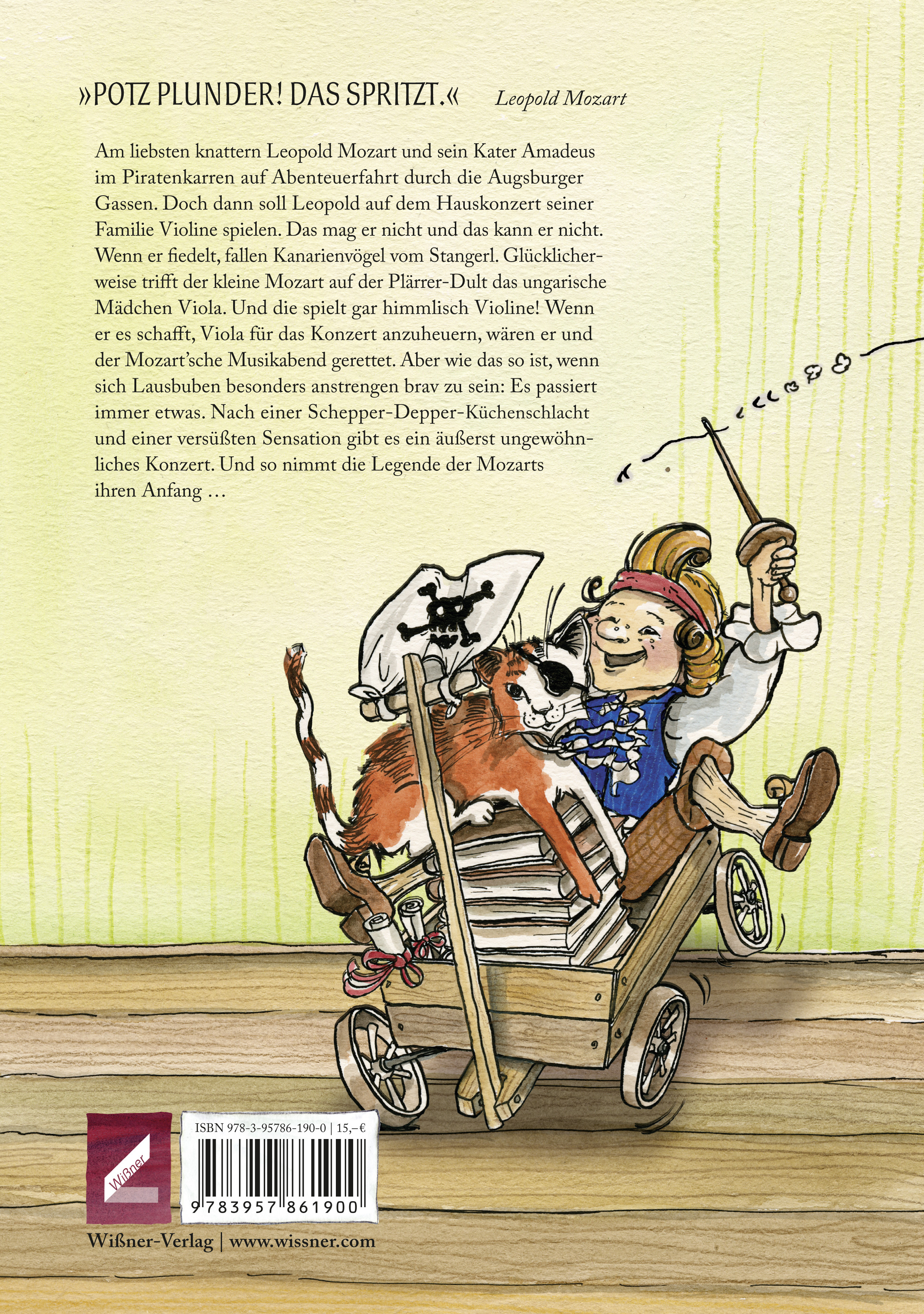 Am liebsten knattern Leopold Mozart und sein Kater Amadeus im Piratenkarren auf Abenteuerfahrt durch die Augsburger Gassen. Doch dann soll Leopold auf dem Hauskonzert seiner Familie Violine spielen. Das mag er nicht und das kann er nicht. Wenn er fiedelt, fallen Kanarienvögel vom Stangerl. Glücklicherweise trifft der kleine Mozart auf der Plärrer-Dult das ungarische Mädchen Viola. Und die spielt gar himmlisch Violine! Wenn er es schafft, Viola für das Konzert anzuheuern, wären er und der Mozart'sche Musikabend gerettet. Aber wie das so ist, wenn sich Lausbuben besonders anstrengen brav zu sein: Es passiert immer etwas. Nach einer Schepper-Depper-Küchenschlacht und einer versüßten Sensation gibt es ein äußerst ungewöhn¬liches Konzert. Und so nimmt die Legende der Mozarts ihren Anfang ...