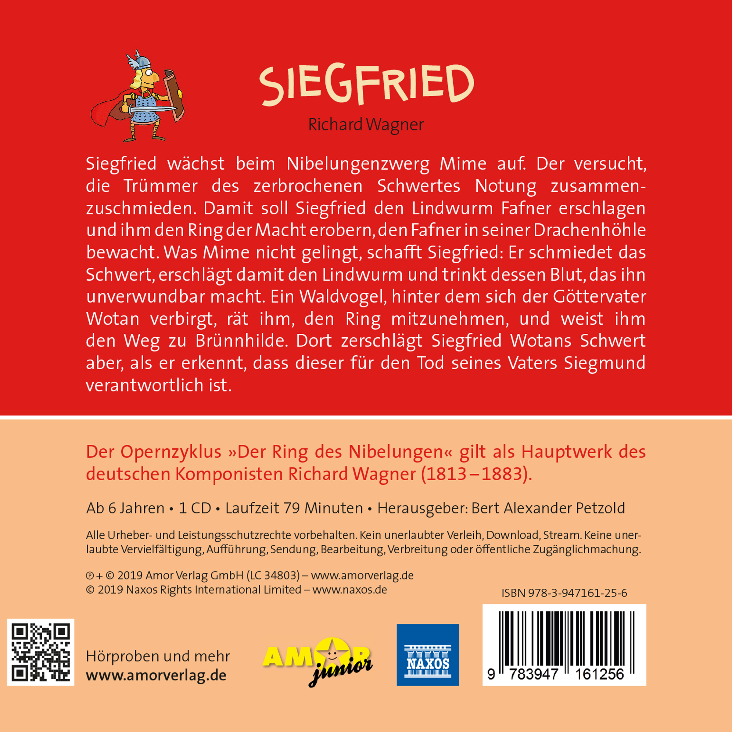 Wir hören Richard Wagners weltweit bekannte Oper "Siegfried" als spannendes Hörspiel, kindgerecht adaptiert und für die ganze Familie. Mit bekannten Melodien, tollen Stimmen und packenden Geräuschen bietet dieses Hörspiel einen bunten Einstieg in die faszinierende Welt der Opern Richard Wagners. Das Hörspiel erscheint im Amor-Verlag als Teil der ZEIT-Edition "Große Oper für kleine Hörer", deren Herausgeber Bert Alexander Petzold ist. Alle Cover der Serie sind im witzig-hintersinnigen Illustrationsstil von Ole Könnecke gestaltet, einem der erfolgreichsten Kinderbuchillustratoren Deutschlands.