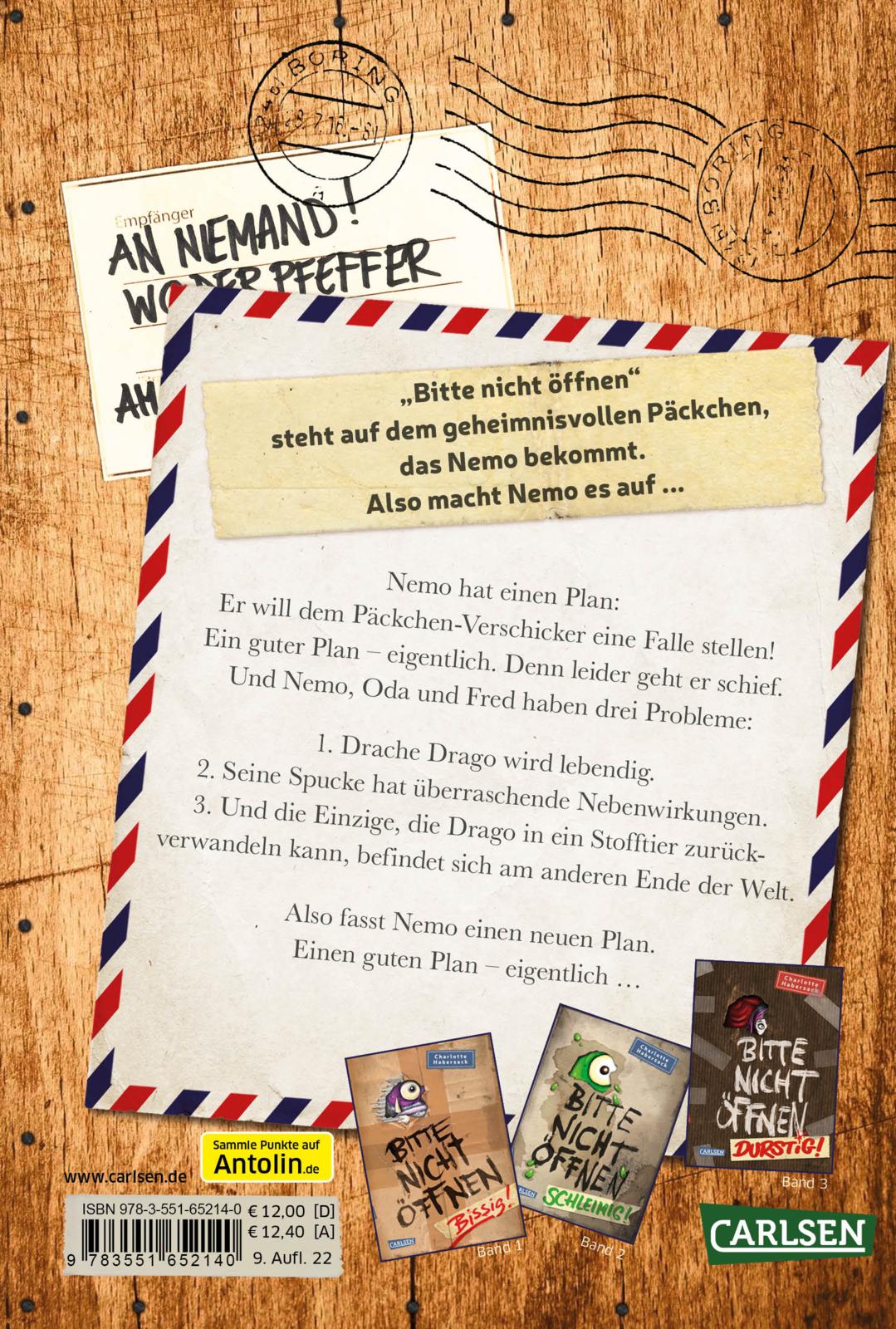 Nemo hat einen Plan: Er will dem Päckchen-Verschicker eine Falle stellen. Leider geht das schief und der Spielzeugdrache Drago wird lebendig. Als ob das nicht schon genug wäre, hat Dragos Spucke auch noch interessante Nebenwirkungen. Doch das größte Problem kommt erst noch: Die Einzige, die Drago in ein harmloses Stofftier zurückverwandeln kann, befindet sich am anderen Ende der Welt. Nemo braucht dringend einen Plan B!