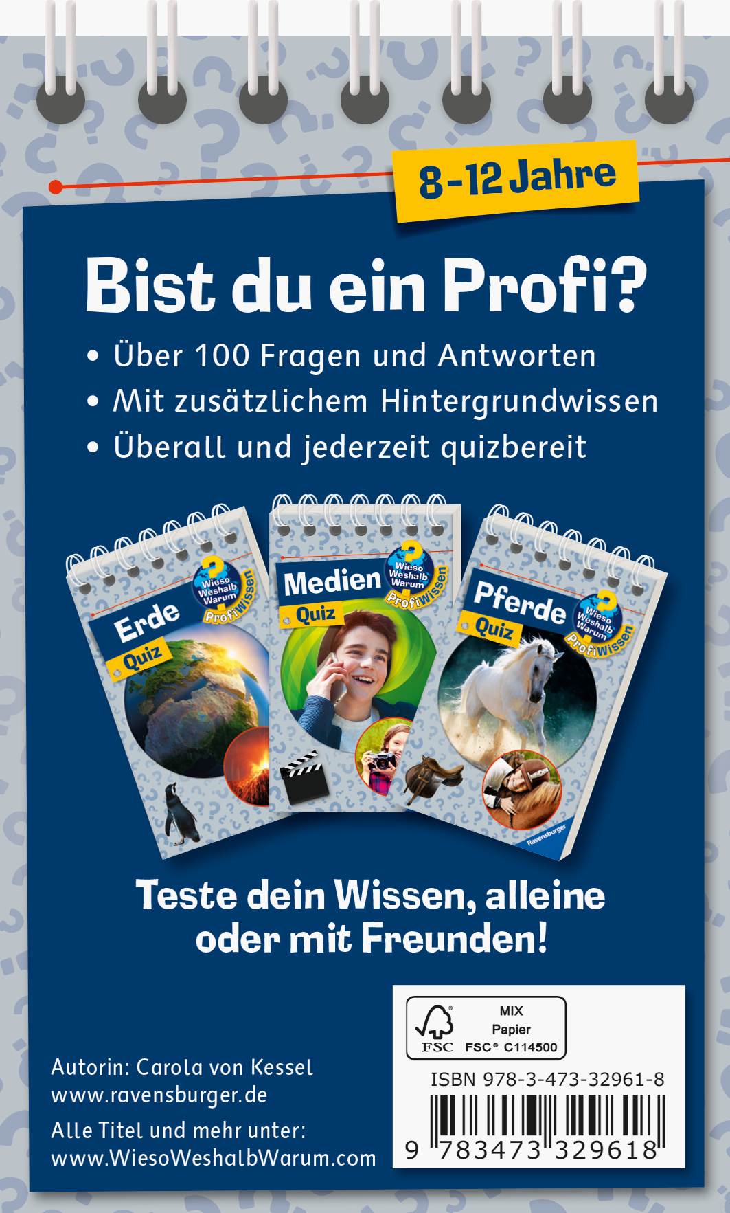 Die Langeweile auf dem Schulhof oder auf langen Auto- und Zugfahrten hat ein Ende: dank des Wieso? Weshalb? Warum? ProfiWissen Quiz. Damit testen Kinder von 8 bis 12 Jahren ihr Wissen über all ihre Lieblingsthemen, allein oder mit Freunden. Der ultimative Rätselspaß bietet über 100 Fragen in verschiedenen Schwierigkeitsgraden und Antworten mit jeder Menge Hintergrundwissen. Der Quizblock passt in jede Tasche - so ist man überall und jederzeit quizbereit.
