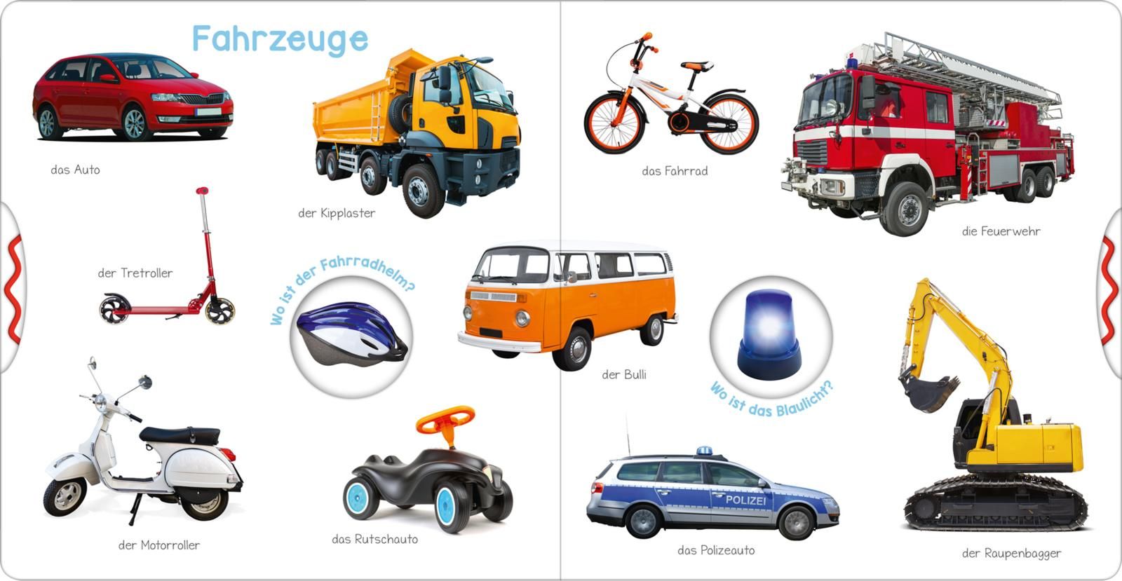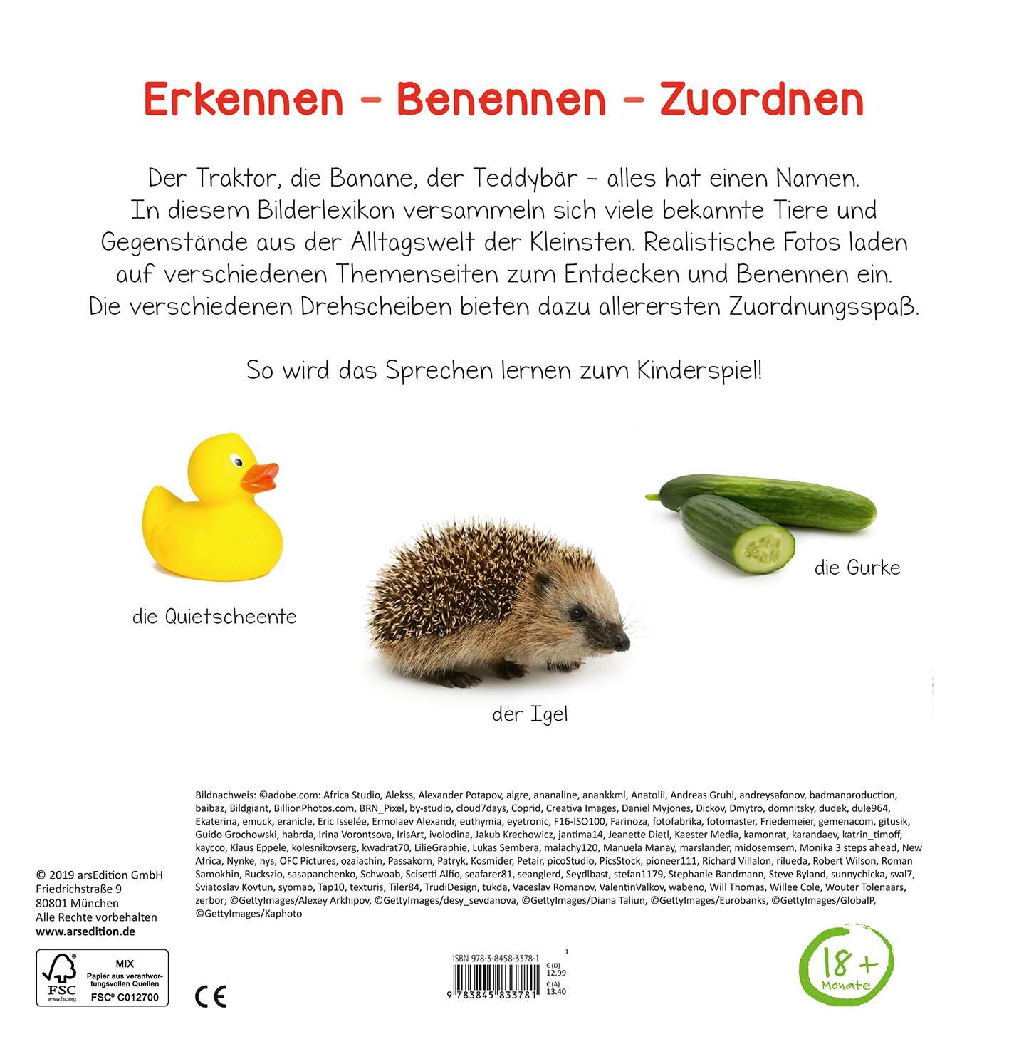 Jeden Tag erobern sich Kleinkinder neugierig ein neues Stück unserer Welt. Sie wollen alles kennenlernen, einordnen und benennen. Dieses große Bilderlexikon hilft ihnen dabei: Realistische Fotos von Tieren, Fahrzeugen und Alltagsgegenständen laden zum Wiedererkennen und Benennen ein, verschiedene Themenseiten helfen darüber hinaus bei der Einordnung und Kategorisierung ihrer Umwelt. Die leichtgängigen Drehscheiben im Buchinneren fördern darüber hinaus die Motorik und stellen die Kleinen vor erste Zuordnungsaufgaben.