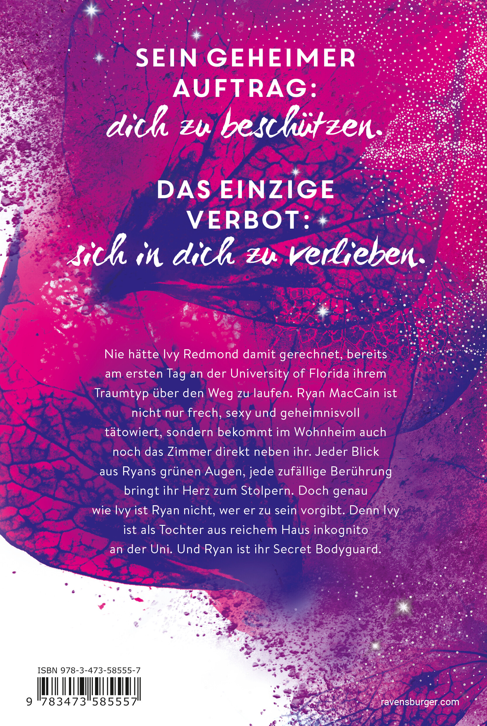 Nie hätte Ivy Redmond damit gerechnet, bereits am ersten Tag an der University of Central Florida ihrem Traumtypen über den Weg zu laufen. Ryan MacCain ist nicht nur frech, sexy und geheimnisvoll tätowiert, sondern bekommt im Wohnheim auch noch das Zimmer direkt neben ihr. Jeder Blick aus Ryans grünen Augen, jede zufällige Berührung bringt ihr Herz zum Stolpern. Doch genau wie Ivy ist Ryan nicht, wer er zu sein vorgibt. Denn Ivy ist als Tochter aus reichem Haus inkognito an der Uni. Und Ryan ist ihr Secret Bodyguard.