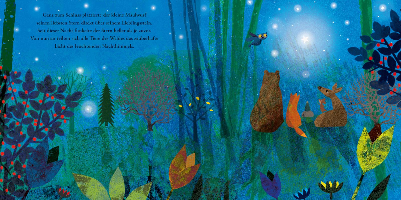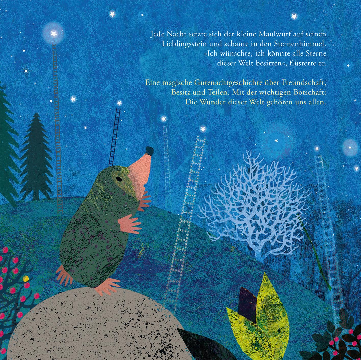 Jede Nacht sitzt der kleine Maulwurf auf seinem Lieblingsstein und schaut in den Sternenhimmel. "Ich wünschte, ich könnte alle Sterne dieser Welt besitzen", flüstert er. Da erscheinen plötzlich Himmelsleitern. Der kleine Maulwurf überlegt nicht lange: er sammelt einen Stern nach dem anderen ein und bringt ihn in seinen Bau, bis alles hell erleuchtet ist! Doch bald erkennt er, wie sehr die anderen Tiere die Sterne vermissen, und versteht: die Sterne gehören ihm nicht allein, sie leuchten für uns alle. Ob die Tiere es gemeinsam schaffen, die Sterne wieder an ihren Platz zu bringen?