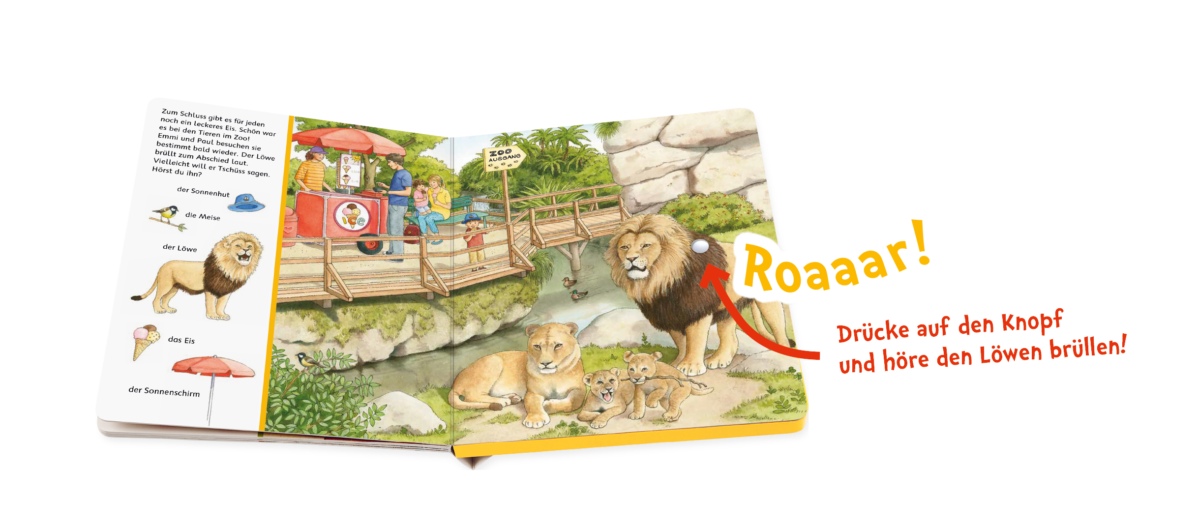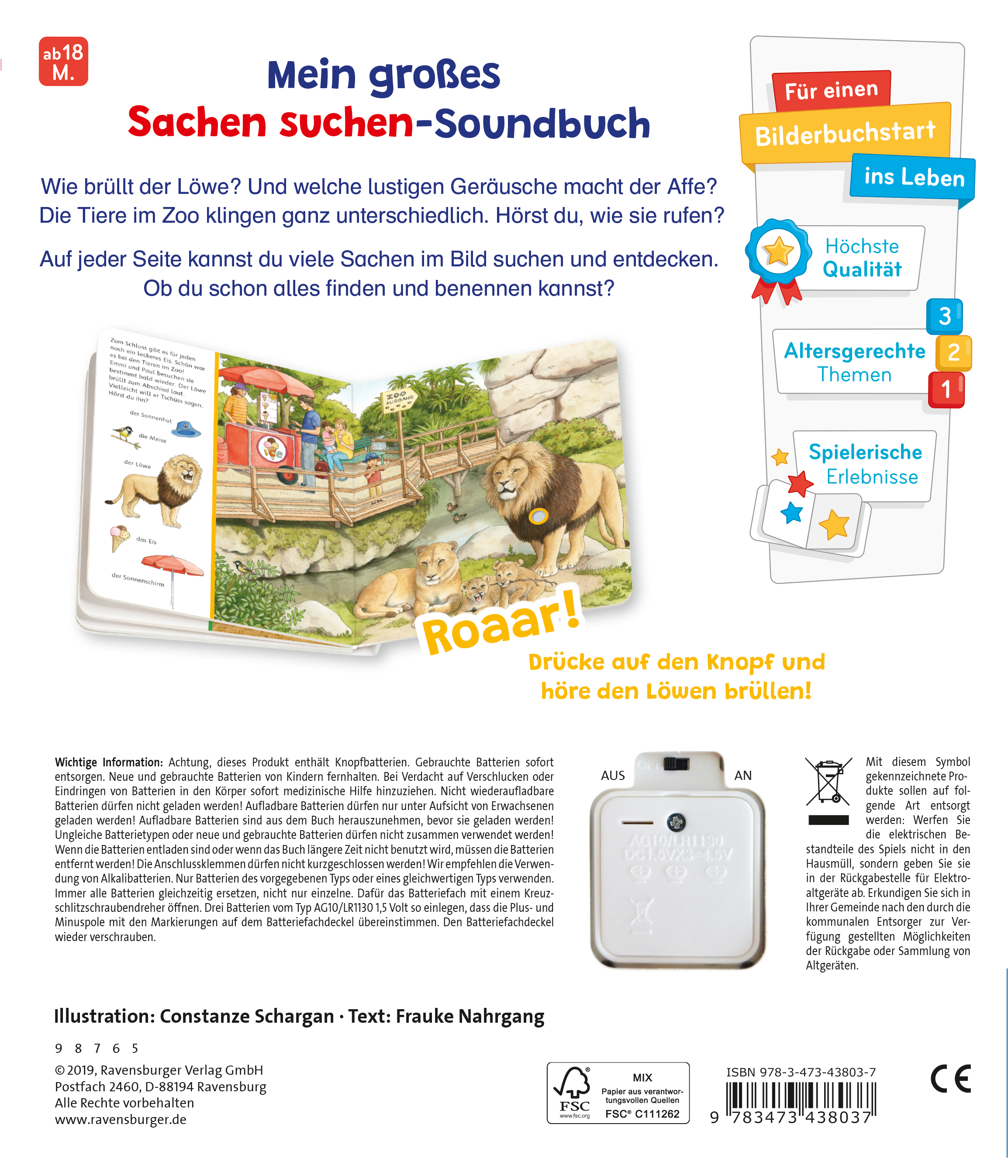 Wie brüllt der Löwe? Und welche lustigen Geräusche macht der Affe? Einfach leicht auf den Knopf drücken, schon erklingt der passende Sound. Und wer genau hinschaut, entdeckt in der großen Szene viele kleine Bilder vom Seitenrand wieder. Das macht Spaß! Die Soundfunktion lässt sich auf der Rückseite des Buches an- und ausschalten. Das Buch enthält eine für Kinder nicht zugängliche Knopfbatterie, die bei Bedarf ausgetauscht werden kann.