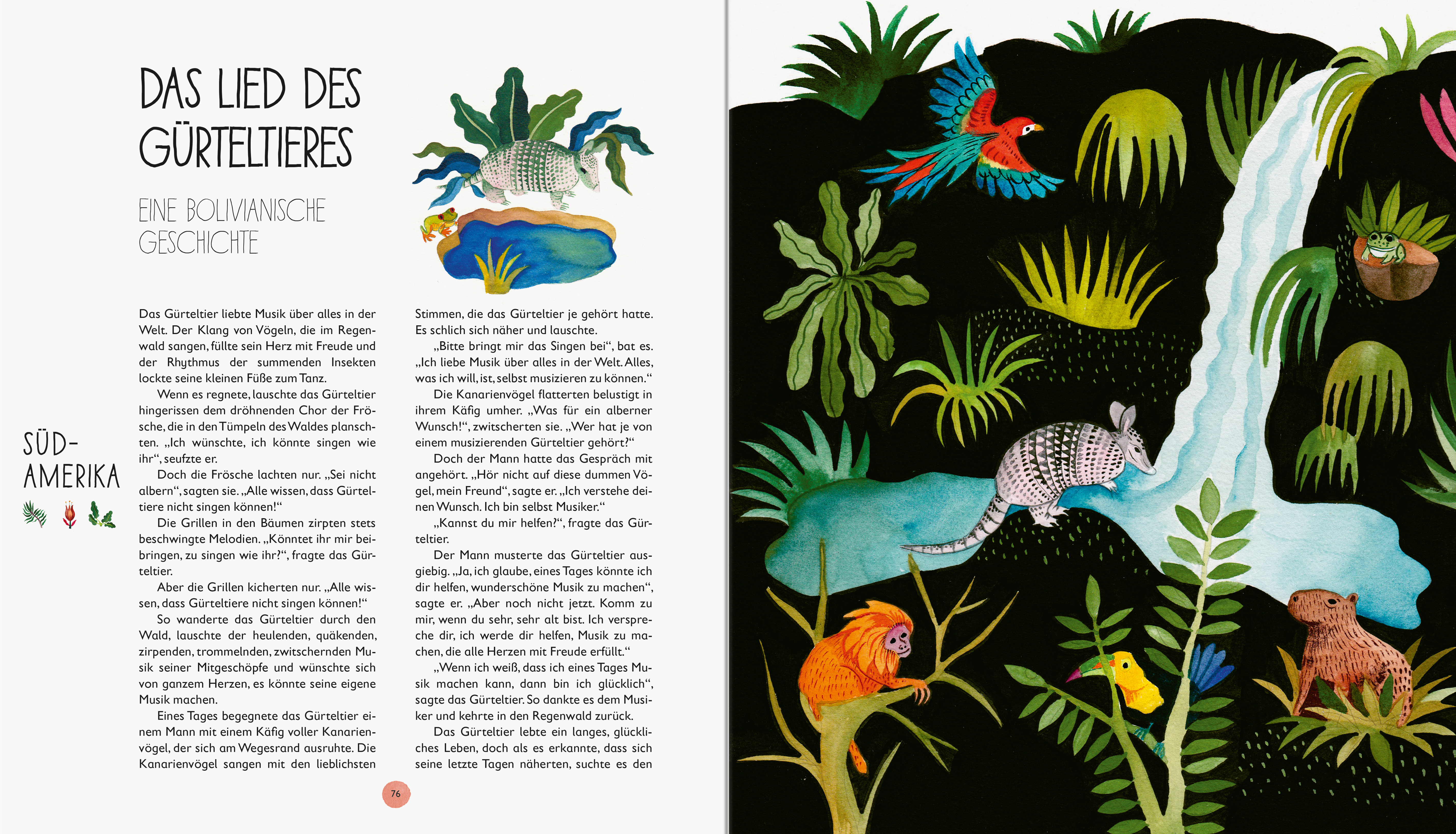 Das Vorlesebuch enthält 50 kurze Vorlesegeschichten, Volkserzählungen und Fabeln aus unterschiedlichen Kulturen. Es vereint bekannte Erzählungen aus der eigenen Heimat und Geschichten aus fernen Ländern und vermittelt somit ein erstes Verständnis für fremde Kulturen. Die einzelnen Geschichten sind nach den Kontinenten ihrer Herkunft in verschiedene Kapitel sortiert. Dementsprechend erzählen die verschiedenen Kapitel Geschichten über ganz unterschiedliche, für den jeweiligen Lebensraum typische Tiere. Visuell besticht dieses Hausbuch durch die folkloristischen, künstlerischen Illustrationen der rumänischen Malerin Aitch. Ihre zahlreichen Bilder machen dieses Buch zu einem Hingucker zwischen all den homogen illustrierten Hausbüchern und wecken auch das Interesse von Erwachsenen.