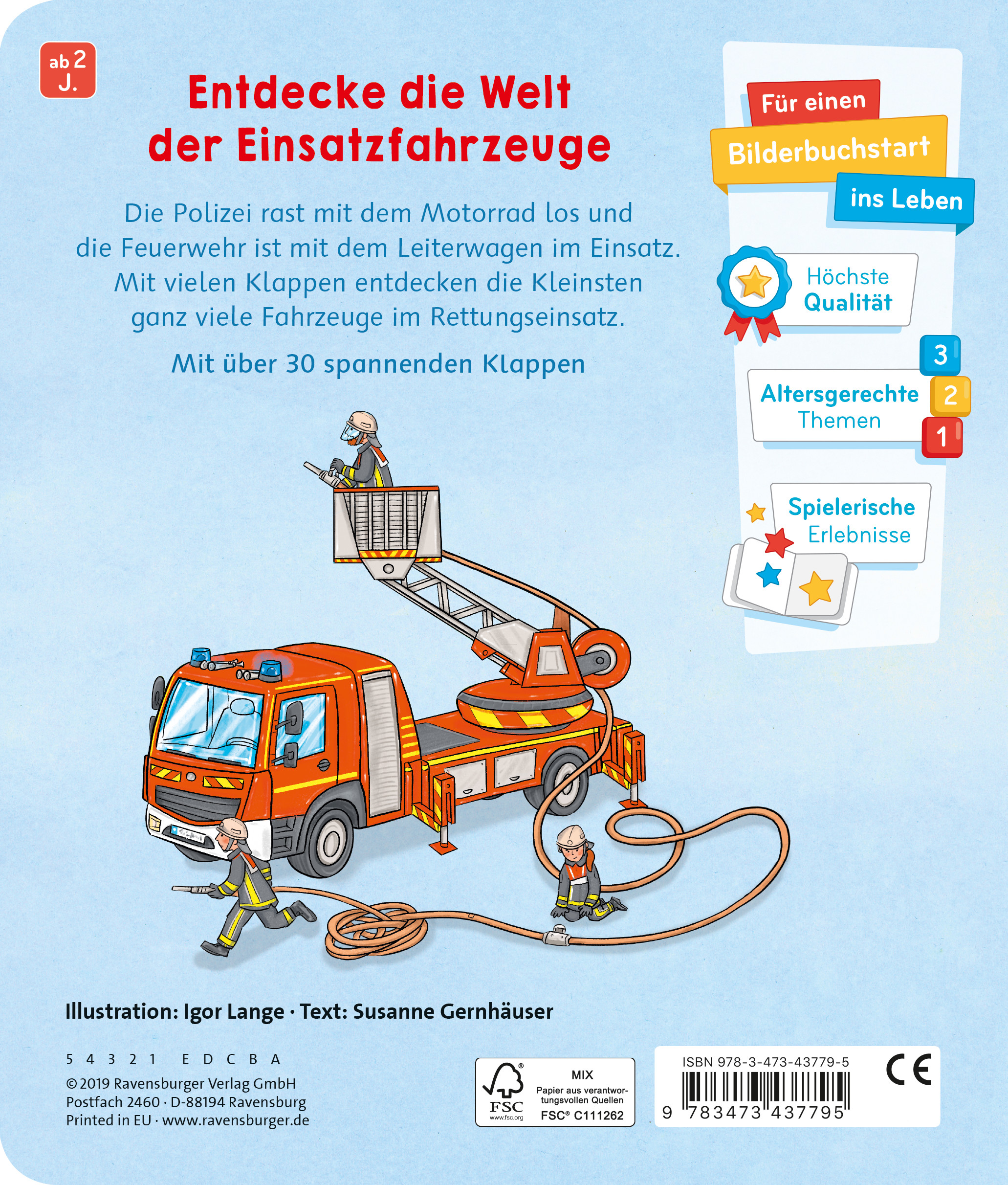 Über 30 Klappen erlauben es Kinder ab 2 Jahren mit den spannenden Fahrzeugen zum Einsatz zu rasen. Hier entdecken Kinder spannende und lustige Veränderungen bei Polizei, Feuerwehr oder Krankenwagen. Bei einem Hochwasser müssen Autos aus dem Wasser gezogen werden und der Rettungshubschrauber fliegt zum Einsatz in die Berge.