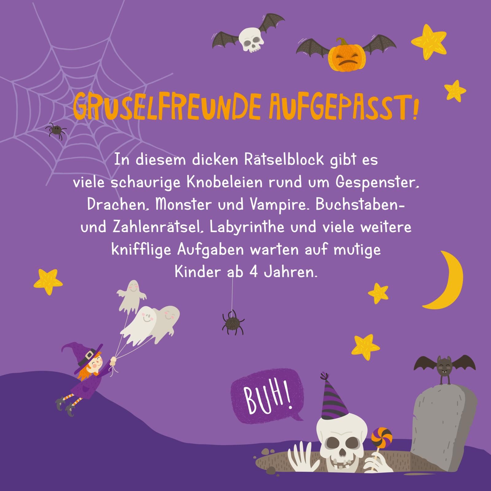 In diesem dicken Rätselblock warten viele schaurige Knobeleien rund um Gespenster, Drachen, Monster und Vampire. Buchstaben- und Zahlenrätsel, Labyrinthe und viele weitere knifflige Aufgaben warten auf mutige Kinder ab 4 Jahren.