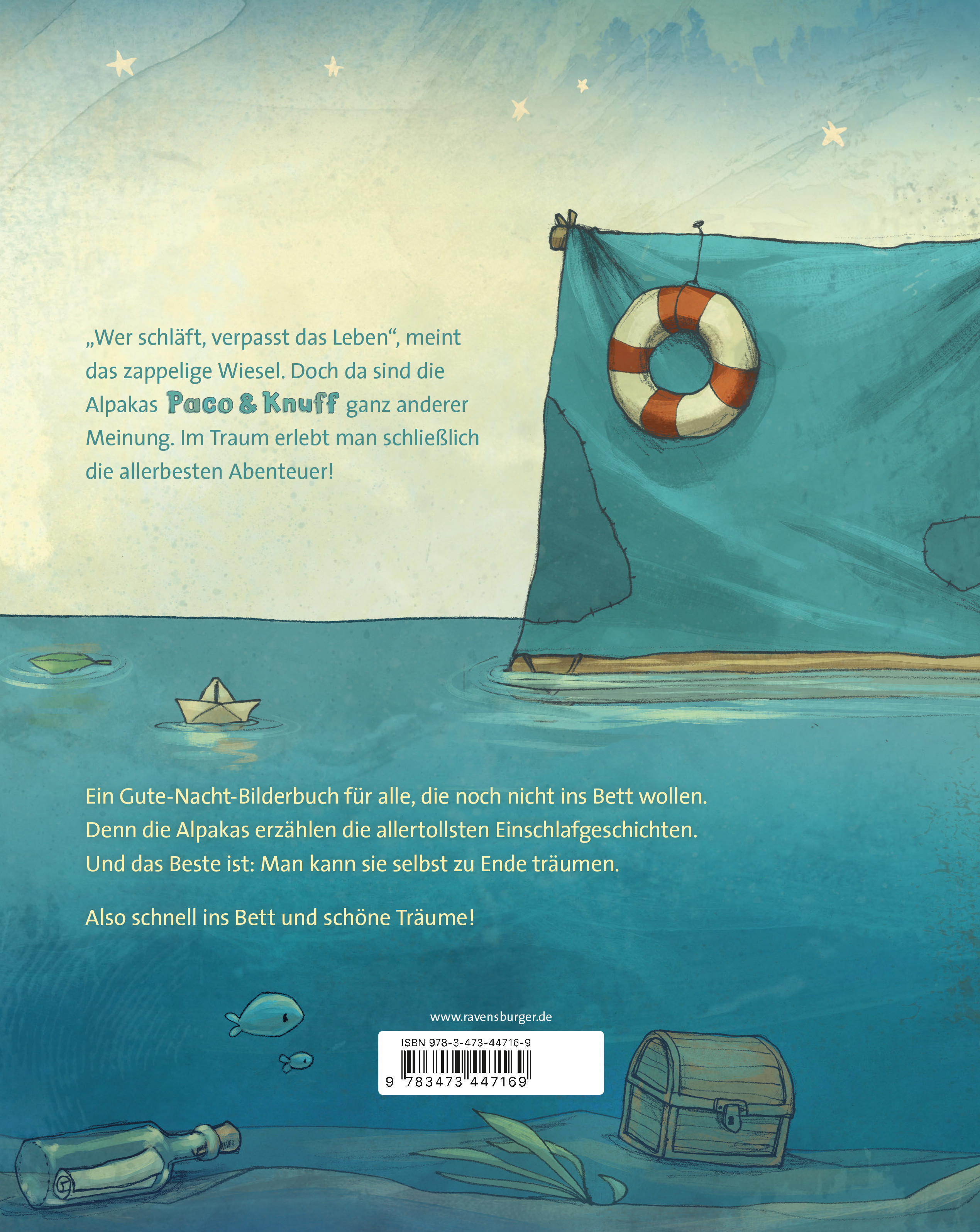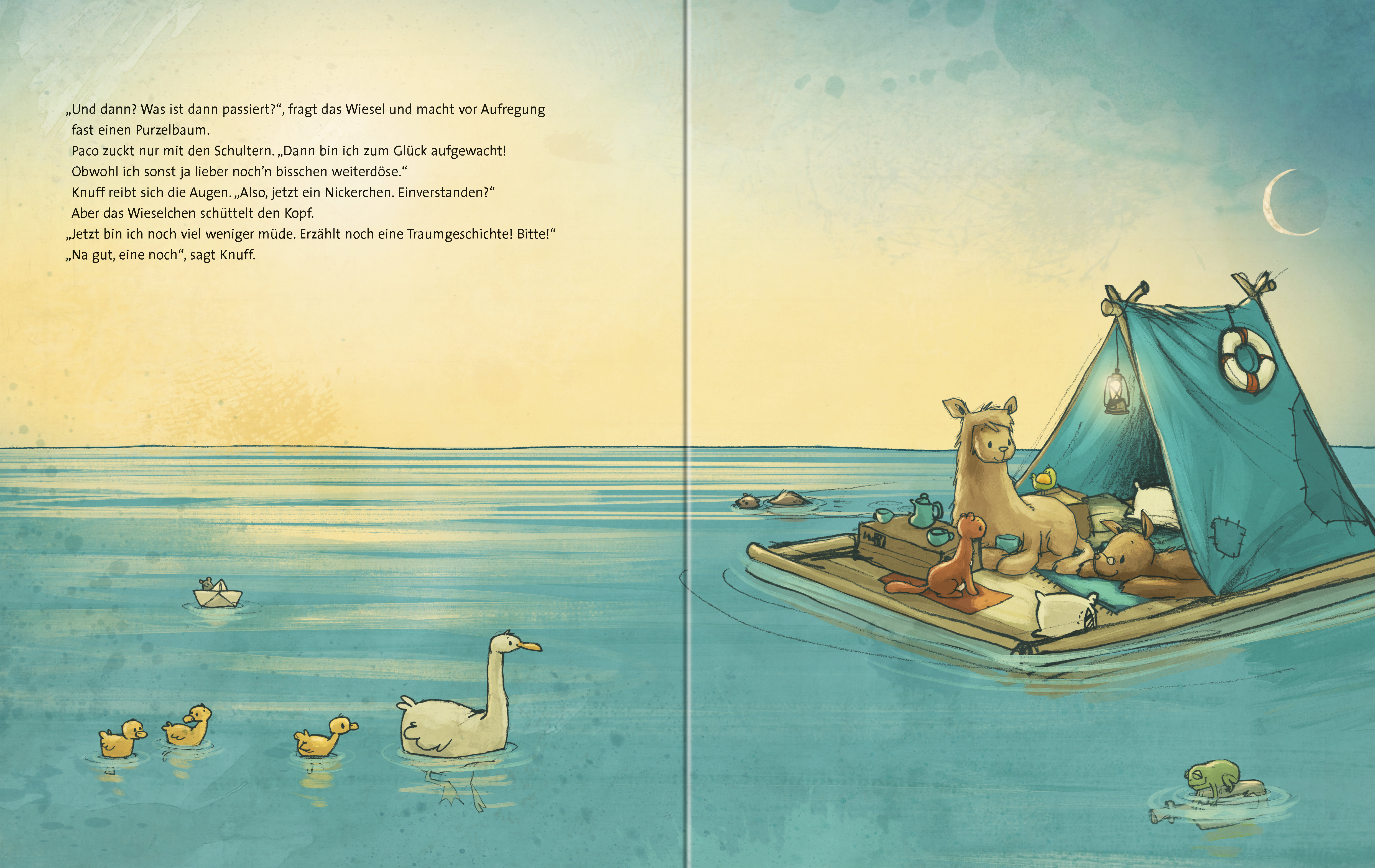 „Langsam ist immer besser!“, ist das Motto der beiden Alpakas Paco und Knuff. So schippern und schlummern sie in Schnarchgeschwindigkeit mit ihrem Hausfloß über den See – bis ein zappeliges Wiesel bei ihnen anheuert. „Wer schläft, verpasst das Leben“, meint das Wiesel und würde am liebsten nie ins Bett gehen. Ob die Alpakas das Wiesel mit ihren Gutenachtgeschichten davon überzeugen können, dass man die besten Abenteuer in seinen Träumen erlebt?
