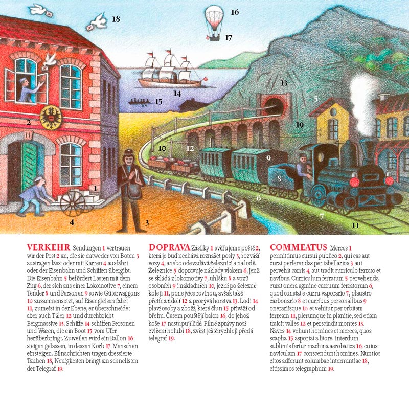 Comenius' Orbis pictus (Welt in Bildern) sollte in keiner Bibliothek gebildeter Eltern fehlen. Die erste Enzyklopädie für Kinder und gleichzeitig das erfolgreichste Sprachlehrbuch aller Zeiten wird schon 360 Jahre lang herausgegeben und ist noch heute aktuell. Es lehrt die Kinder gleich in mehreren Sprachen auf einmal, richtig zu unterscheiden, zu benennen, die Welt kennenzulernen. Es legt so das Fundament für den staunenswerten Gedankenaustausch, der Europa charakterisiert. Die Auswahl für Kinder ist durch die Illustrationen des bedeutenden tschechischen Künstlers Václav Sokol einmalig. Erstmals wird hier den Bildern ebenso viel Raum gewährt wie den Texten. Als Vorlage diente dem Maler die Ausgabe von 1883, die sein Urgroßvater für den Druck vorbereitet hat. Aus dieser Ausgabe ist auch das Latein als Grundlage aller europäischen Sprachen übernommen. Die neue tschechische und die deutsche Übersetzung wenden sich an heutige Kinder. Das Buch ist für die Jüngsten zum Anschauen gedacht, für die Älteren zum Sprachenunterricht, für Eltern und Großeltern, um mit den Kindern im Buch zu lesen und die Welt der Erkenntnis neu zu entdecken, die ihm der Lehrer der Nationen Johann Amos Comenius (Jan Amos Komenský) erschließt.