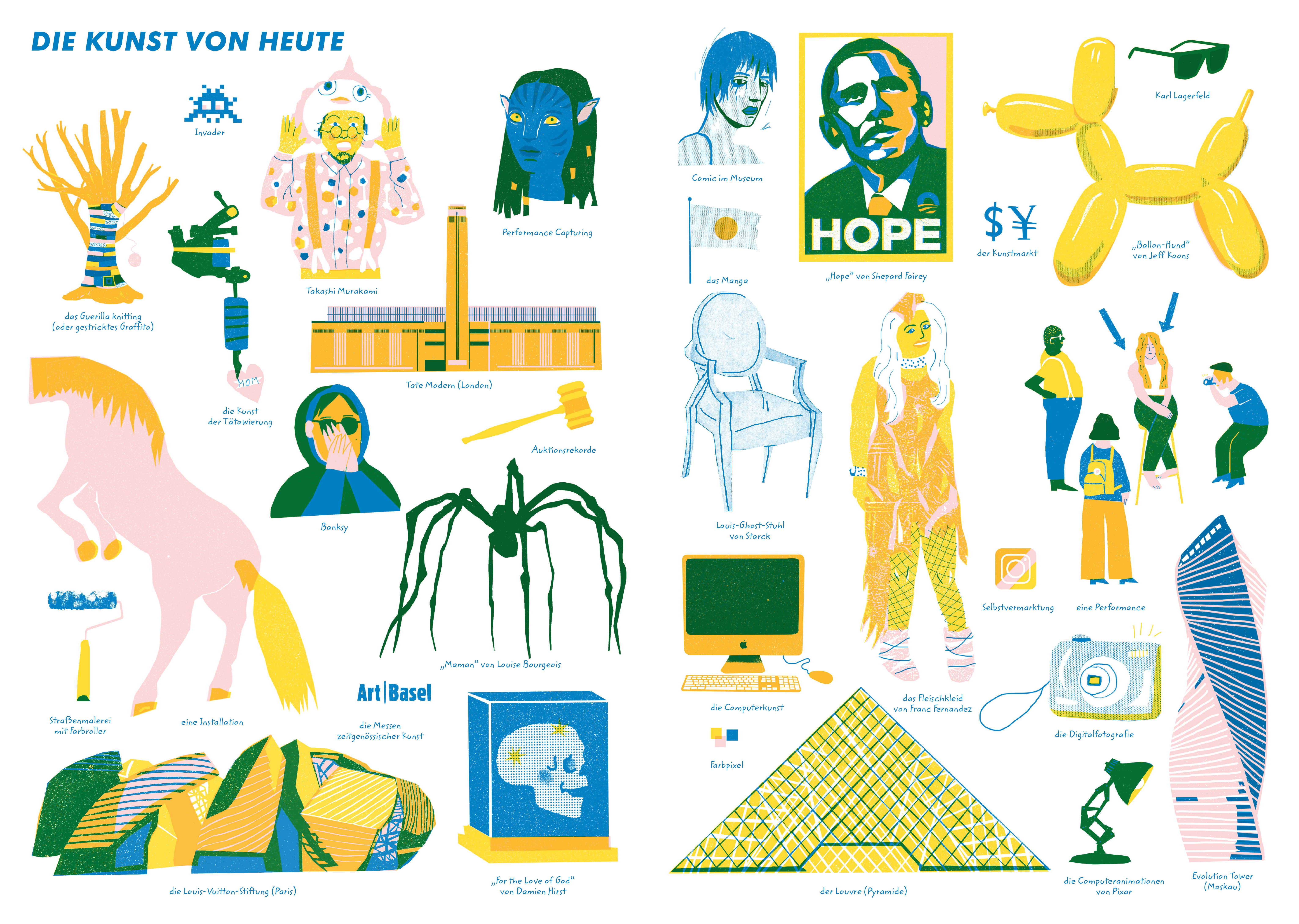 Von der Höhlenmalerei bis zu Banksy - dieses Kinderbuch ist der perfekte Start zu einem lebenslangen Kunstverständnis. Hier können Kinder entdecken, wie die Steinzeitmenschen ihre Bilder an Höhlenwände malten, wie alte Zivilisationen ihre Götter verehrten, wie im Mittelalter die Klöster Zentren christlicher Kunst waren, während gleichzeitig in Asien riesige Buddha-Statuen geschaffen wurden, und wie wissenschaftliche Entdeckungen Maler und Bildhauer der Renaissance inspirierten. Sie treffen auf Künstler, die in historischen und kulturellen Revolutionen eine Schlüsselrolle spielten, und erfahren, wie technische Erfindungen sich auf Kunst und Architektur auswirkten. Sie beobachten Andy Warhol bei der Arbeit in seiner "Factory" und besuchen ein modernes Museum, um zu sehen, was heutige Künstler schaffen.Über 10000 Jahre Kunst- und Kulturgeschichte sind in diesem Buch in fantastischen Illustrationen von Louise Lockhart zusammengefasst. Den zehn großen Epochen der Kunst sind jeweils zwei Doppelseiten gewidmet. Erst werden in einem großem Schaubild die bedeutendsten Schlüsselwerke illustriert: Gemälde, Skulpturen, Künstler, Architektur sowie bahnbrechende Erfindungen und charakteristische Artefakte ergeben ein buntes Bild dessen, was die jeweilige Epoche auszeichnet. Auf der folgenden Doppelseite lassen sich dann wie in einem Suchspiel eine Reihe dieser Gegenstände in einem szenischen Bild wiederfinden. Auf geniale Weise werden hier die Highlights der Kunst vorgestellt und in ihren kulturellen und historischen Zusammenhängen verstanden.