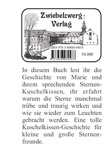 In diesem Buch lest ihr die Geschichte von Marie und ihrem sprechenden Sternen-Kuschelkissen, ihr erfahrt warum die Sterne manchmal trübe und traurig wirken und wie sie wieder zum Leuchten gebracht werden. Eine tolle Kuschelkissen-Geschichte für kleine und große Sternenfreunde.