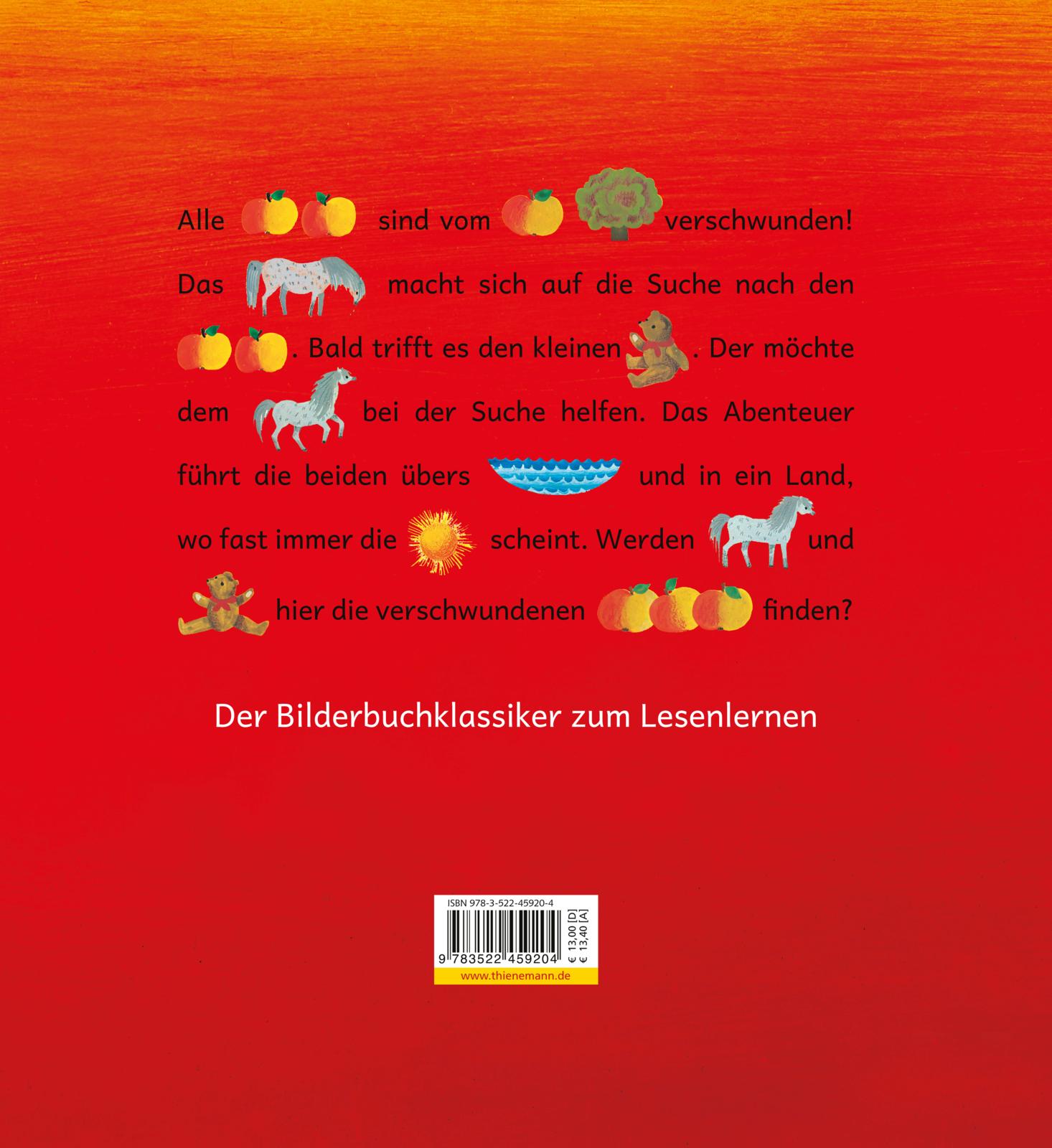 Alle Äpfel sind vom Apfelbaum verschwunden! Kein einziger hängt mehr am Baum. Das Pony lässt sich davon nicht unterkriegen. Es macht sich auf die Suche nach den Äpfeln, von alleine können die schließlich nicht fortlaufen. Am Waldrand trifft das Pony den kleinen Bären. Der möchte dem Pony bei der Suche helfen. Das Abenteuer führt die beiden übers Meer und in ein Land, wo fast immer die Sonne scheint. Werden Pony und Bär hier die verschwunden Äpfel finden?