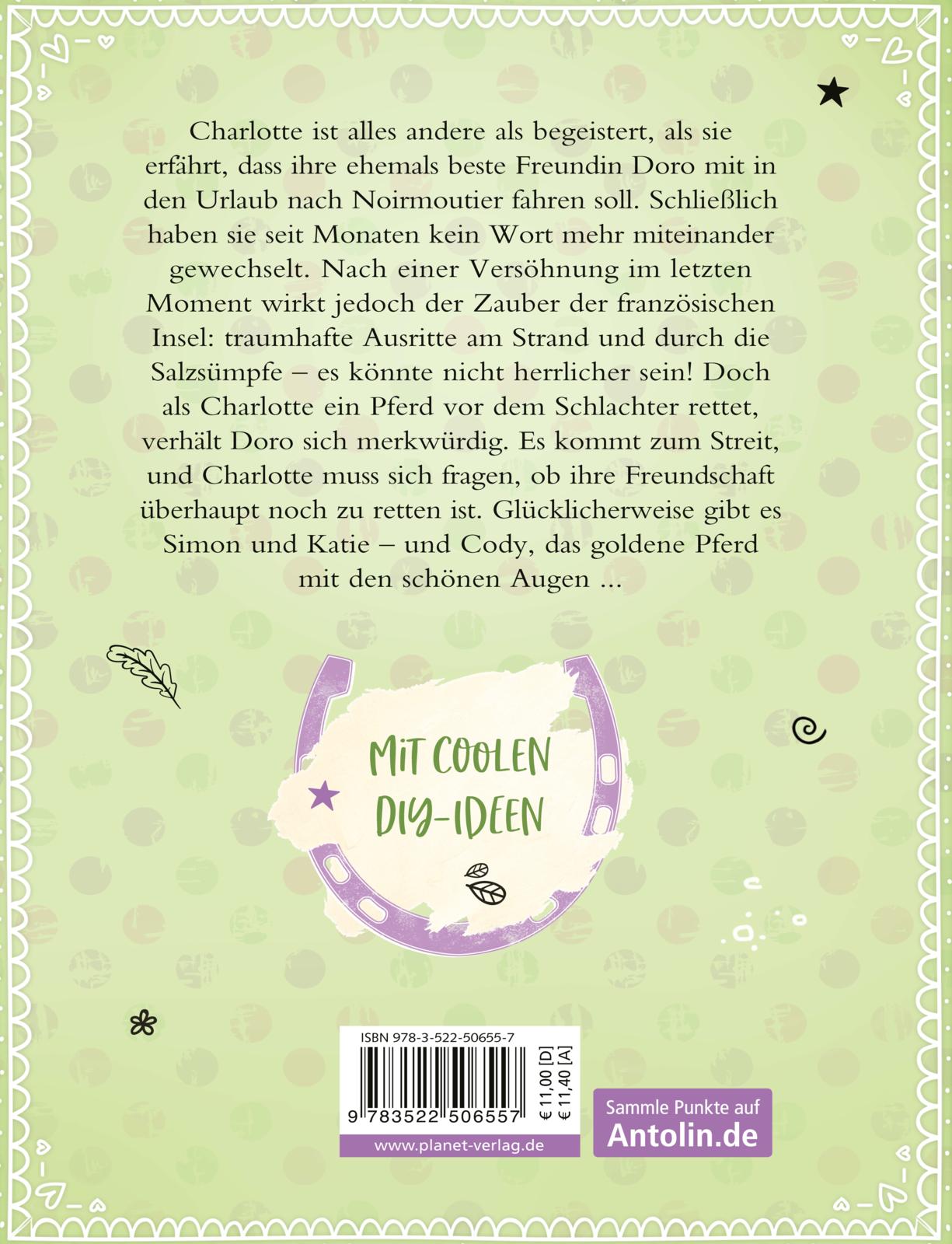 Charlotte ist alles andere als begeistert, als sie erfährt, dass ihre ehemals beste Freundin Doro mit in den Urlaub nach Noirmoutier fahren soll. Schließlich reden sie kaum noch miteinander. Doch dann wirkt der Zauber der französischen Insel: traumhafte Ausritte am Strand und durch die Salzsümpfe - es könnte nicht herrlicher sein! Zurück zu Hause stehen die Kreismeisterschaften an, und Charlotte hat die Chance, in den Kader aufgenommen zu werden. Doch plötzlich lahmt Won Da Pie, das einzige Pferd, mit dem Charlotte trainiert hat. Ihr Traum scheint zu platzen - aber wofür hat man Freundinnen?