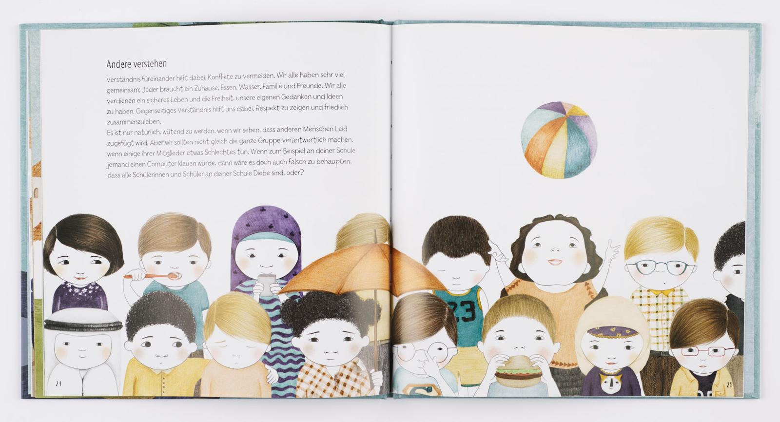 Kinder, die in Europa aufwachsen, kennen Krieg meist nur aus Geschichten und von Bildern. Das, was sie darüber erfahren, macht ihnen oft Angst. Dann fragen sie sich: Bin ich selbst auch in Gefahr? Was ist Terrorismus? Und warum gibt es überhaupt Soldaten? Der dritte Band der Reihe erklärt den Unterschied zwischen Streit und Krieg und welche Auswirkungen gewaltsame Konflikte haben können. Das Bilderbuch zeigt aber auch, dass sich viele Menschen auf der ganzen Welt für Frieden einsetzen.