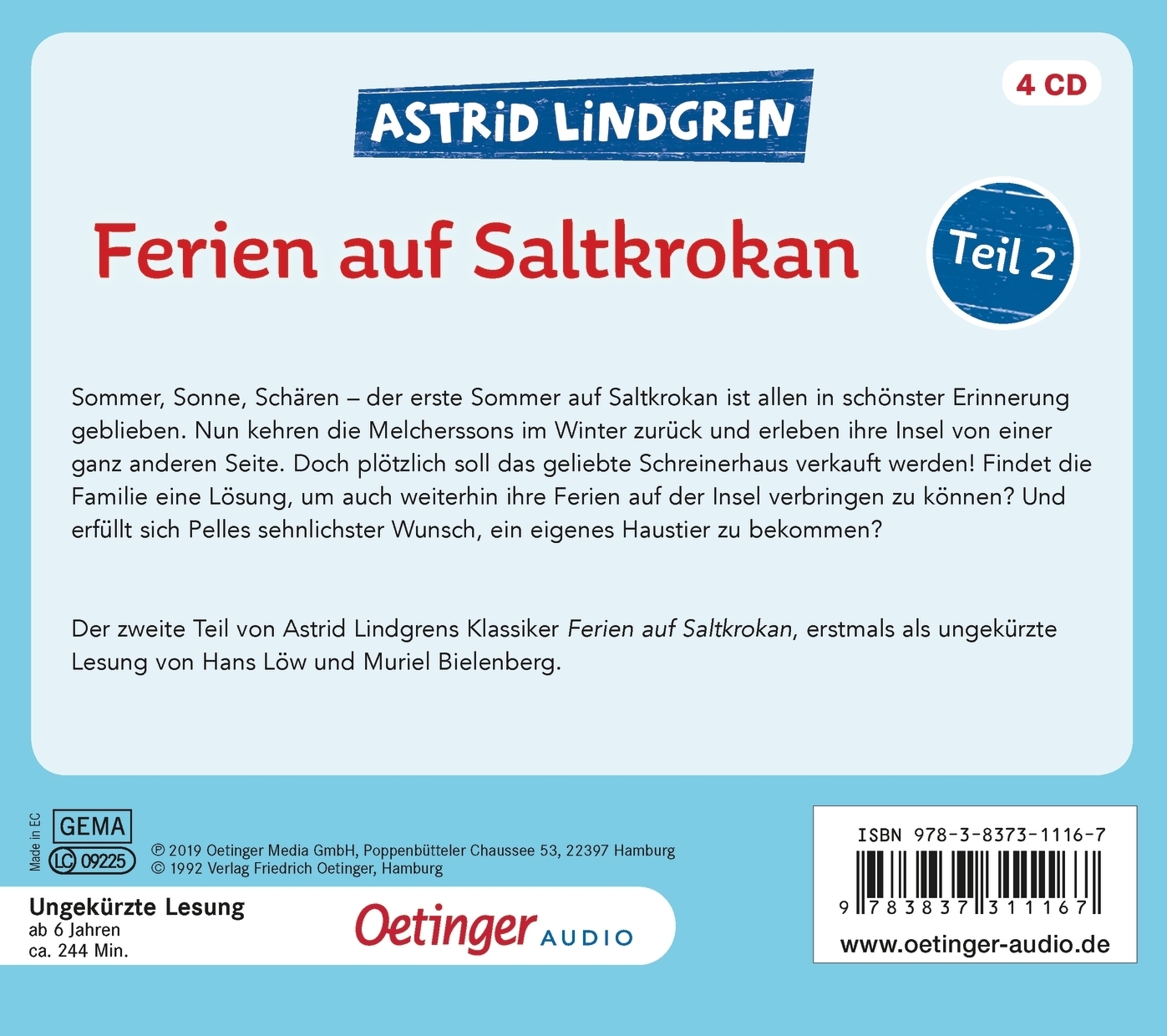 Ungekürzte Lesung, ca. 260 Minuten. Endlich wieder zurück - mit Astrid Lindgren auf Saltkrokan. Sommer, Sonne, Schären - der erste Sommer auf Saltkrokan ist allen in schönster Erinnerung geblieben. Nun kehren die Melcherssons im Winter zurück und erleben ihre Insel von einer ganz anderen Seite. Doch plötzlich soll das geliebte Schreinerhaus verkauft werden! Findet die Familie eine Lösung, um auch weiterhin ihre Ferien auf der Insel verbringen zu können? Und erfüllt sich Pelles sehnlichster Wunsch, ein eigenes Haustier zu bekommen?