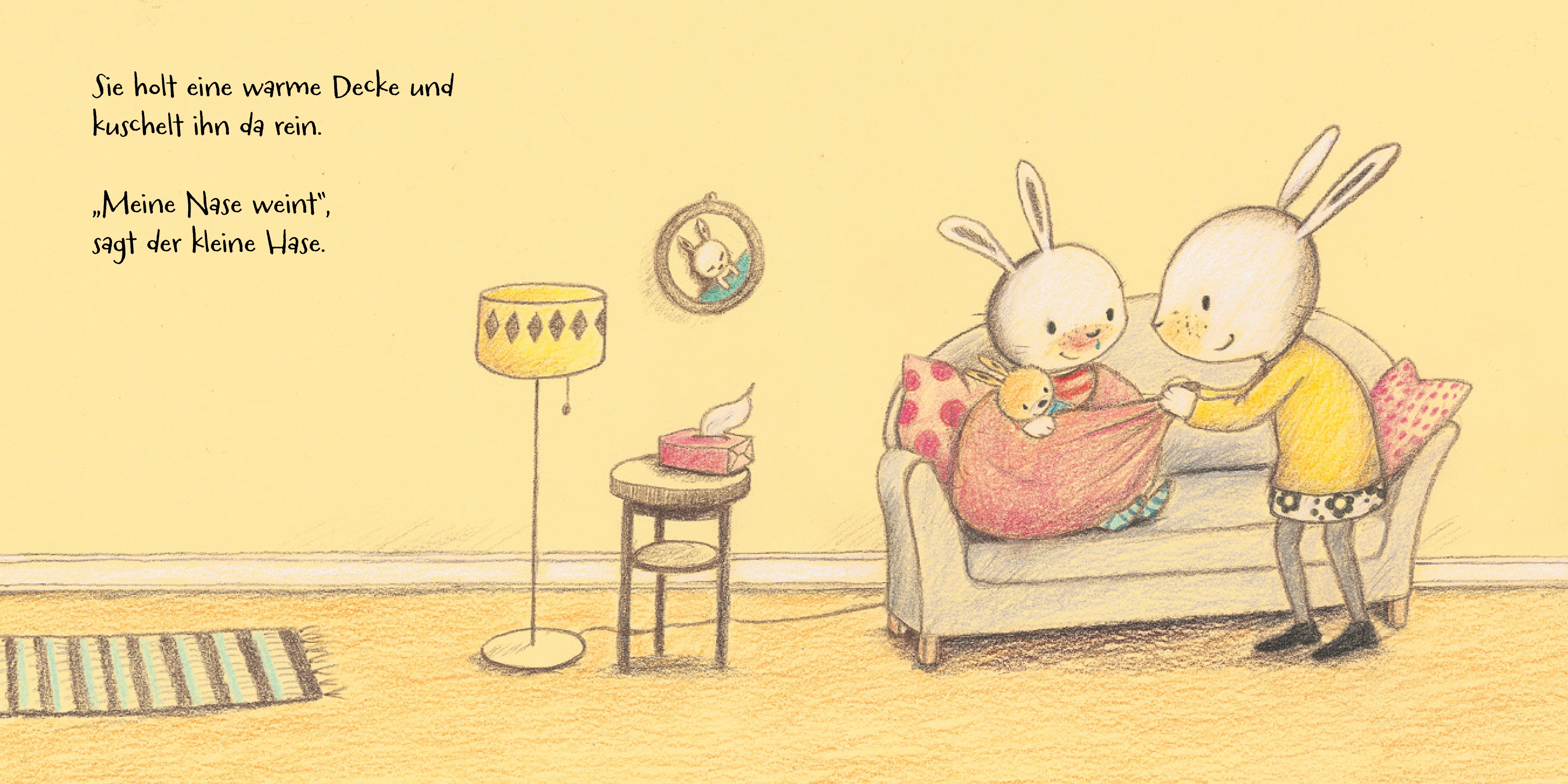 Der kleine Hase kommt vom Spielen nach Hause. Er zittert und bibbert. "Oje", sagt seine Mama. "Kalte Ohren, rote Nase, Schnupfen hat mein kleiner Hase!". Da helfen eine warme Decke, etwas Leckeres zu Essen und ein heißer Tee. Doch die beste Medizin ist natürlich ein dicker Kuss von Mama.