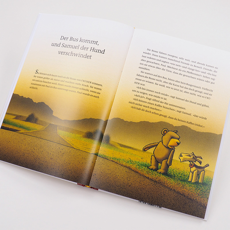 Alfred und Samuel haben es satt, noch länger im muffigen Pappkarton zu sitzen. Es muss doch mehr im Leben alter Stofftiere geben, als zu schlafen, zu zanken und in Erinnerungen zu wühlen! Lieber machen sie sich auf die Suche nach Paul. Der hat sie nämlich einmal geliebt! Jedenfalls glauben sich die beiden daran zu erinnern. Und daran, dass es warm war und einen Gutenachtkuss gab. Aber wo ist Paul hingegangen? Mutig marschieren die beiden Stofftiere gen Süden, trotzen Kälte und Regen, gefährlichen Hunden und gefräßigen Vögeln, ja sogar dem Hunger, wenn sie an Heidelbeer-Pfannkuchen denken. Ob sie Paul jemals finden? Er ist ja längst erwachsen. Aber jetzt ist Lisa da, und die nimmt sie mit ins Bett und gibt ihnen den lang ersehnten Gutenachtkuss!